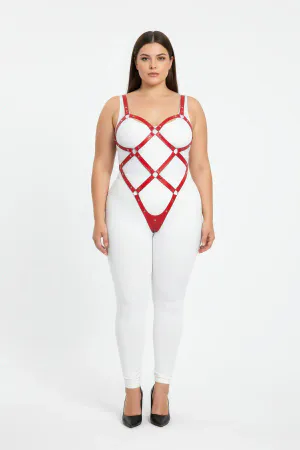 Büyük Beden Kırmızı Kadın Deri Full Body Harness Takım Halka Detaylı Vücut Aksesuarı - APFT542