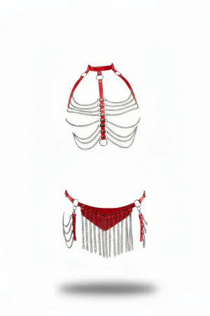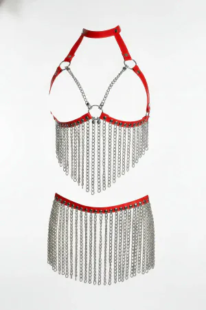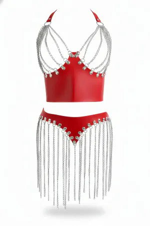 Kırmızı Etek Suni Deri Etek Zincir Detaylı Etek Püskül Kemer - APFT328