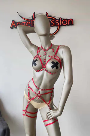 Fantezi Deri Giyim Kırmızı Harness Jartiyer Takım - APFT289