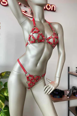 Kırmızı Deri Sütyen Takım Deri İç Giyim