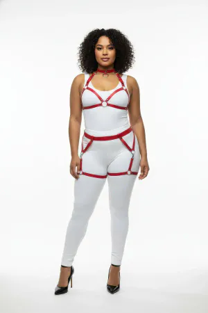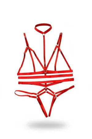 Kırmızı Harness Takım Boyun Bağlı Halka Detaylı Vücut Kafesi - APFT144