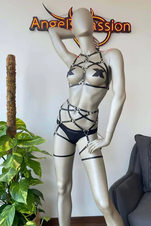 Siyah Deri Jartiyer Harness Fantezi İç Giyim Takım