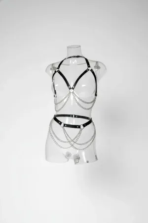 Siyah Harness Takım Zincir Detaylı Suni Deri Vücut Aksesuarı - APFT1384