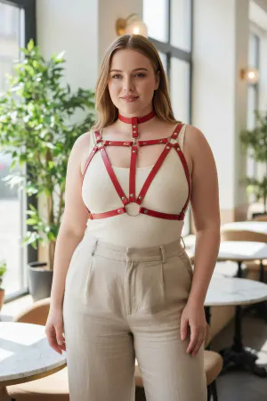 Büyük Beden Kırmızı Kadın Kemer Halka Detaylı Deri Harness Vücut Aksesuarı - APFT747
