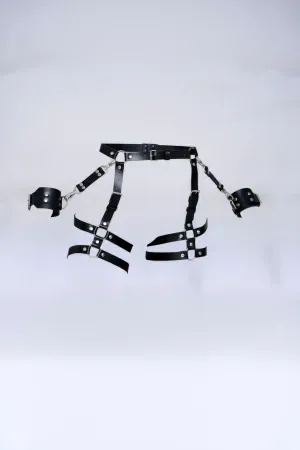 Siyah Tanga - Külot Çoklu Kemerli Metal Detaylı Bilek Kelepçeli Jartiyer - APFT1022
