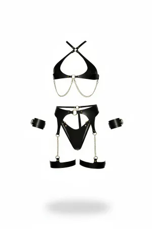 Siyah Harness Takım Zincir Detaylı Suni Deri Kelepçeli Set - APFT1219