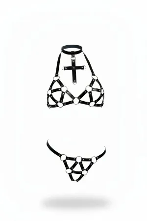 Siyah Harness Takım Haç Detaylı Halkalı Deri - APFT464