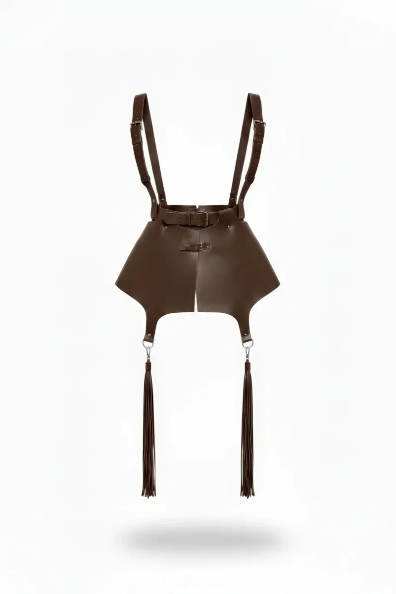 Kahverengi Etek Deri Omuzdan Bağlamalı Püsküllü Mini Etek - APFT787