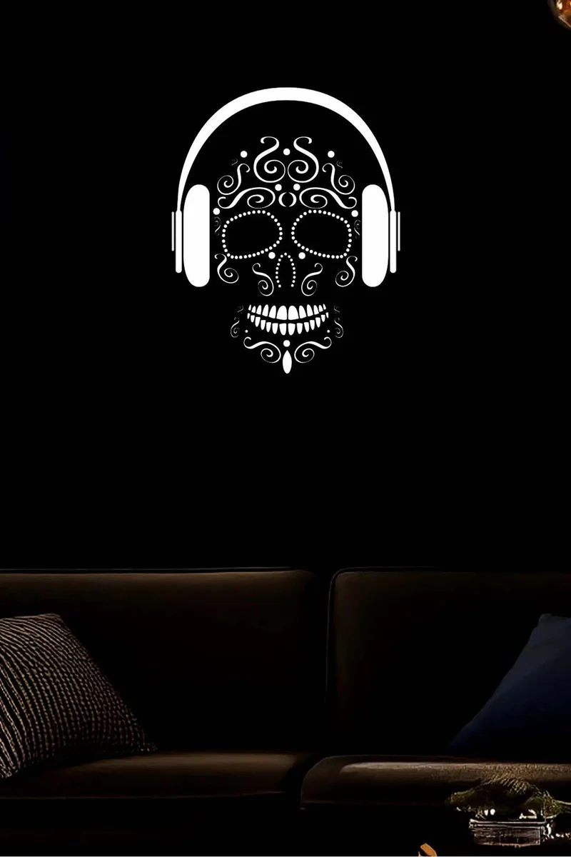 Reflektörlü Dekoratif Kulaklıklı Kuru Kafa (Sugar Skull) Deri Tablo