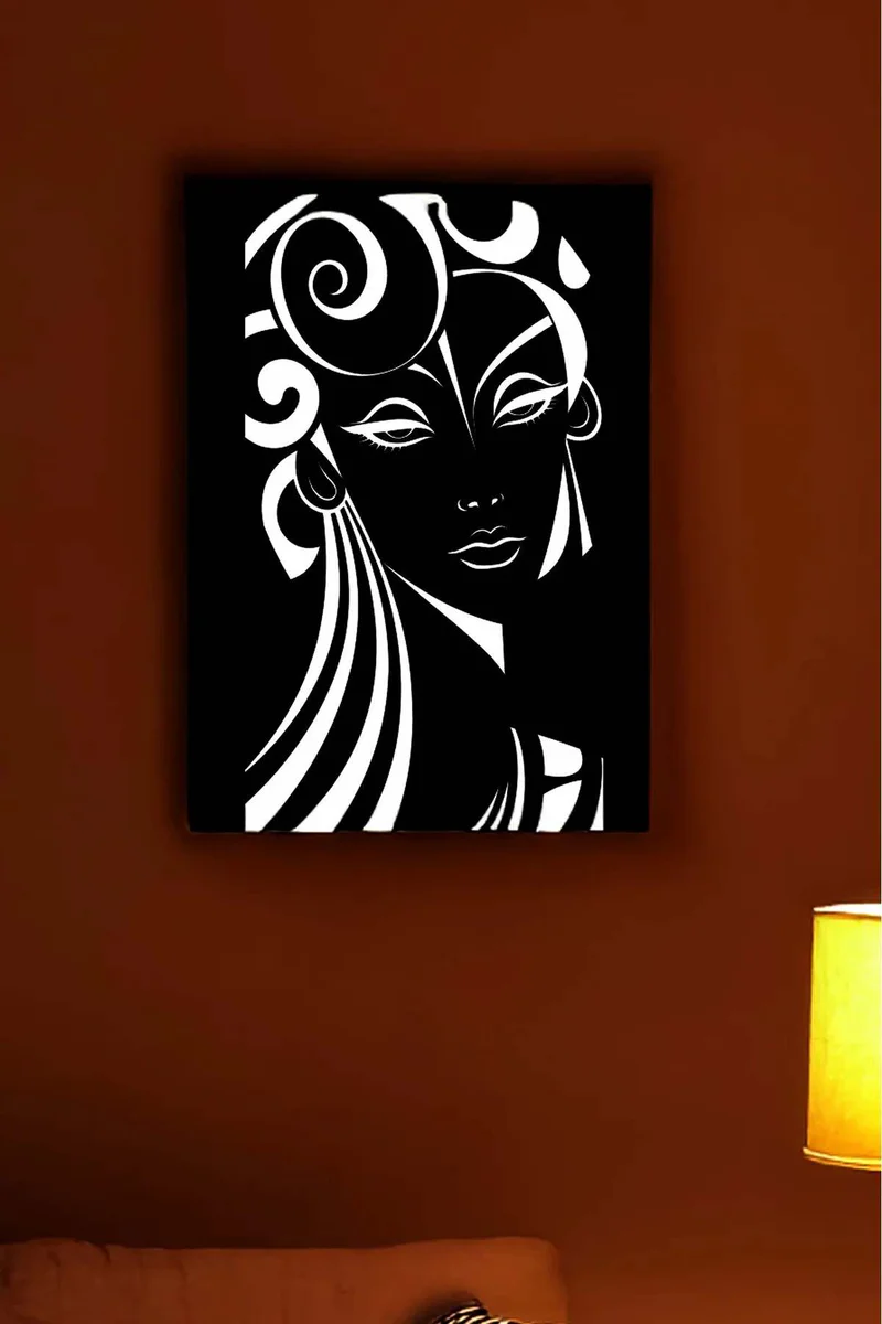 Reflektörlü Stilize Kadın Figürü Siyah Deri Zeminli Modern Tablo