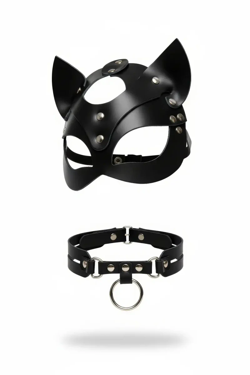 Siyah Maske Kedi Kulaklı Zımba Detaylı Deri Yüz Maskesi - APFT789