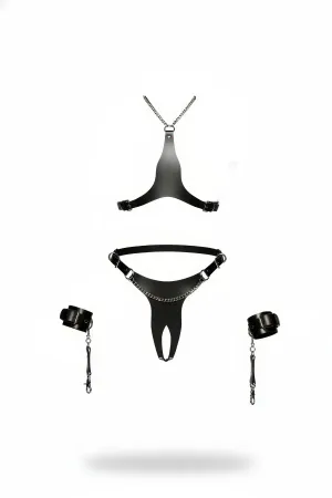 Siyah Harness Takım Deri Zincir Detaylı 4 Parçalı - APFT1232