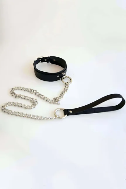 Siyah Deri Metal Halkalı Zincirli Choker Tasma SH246