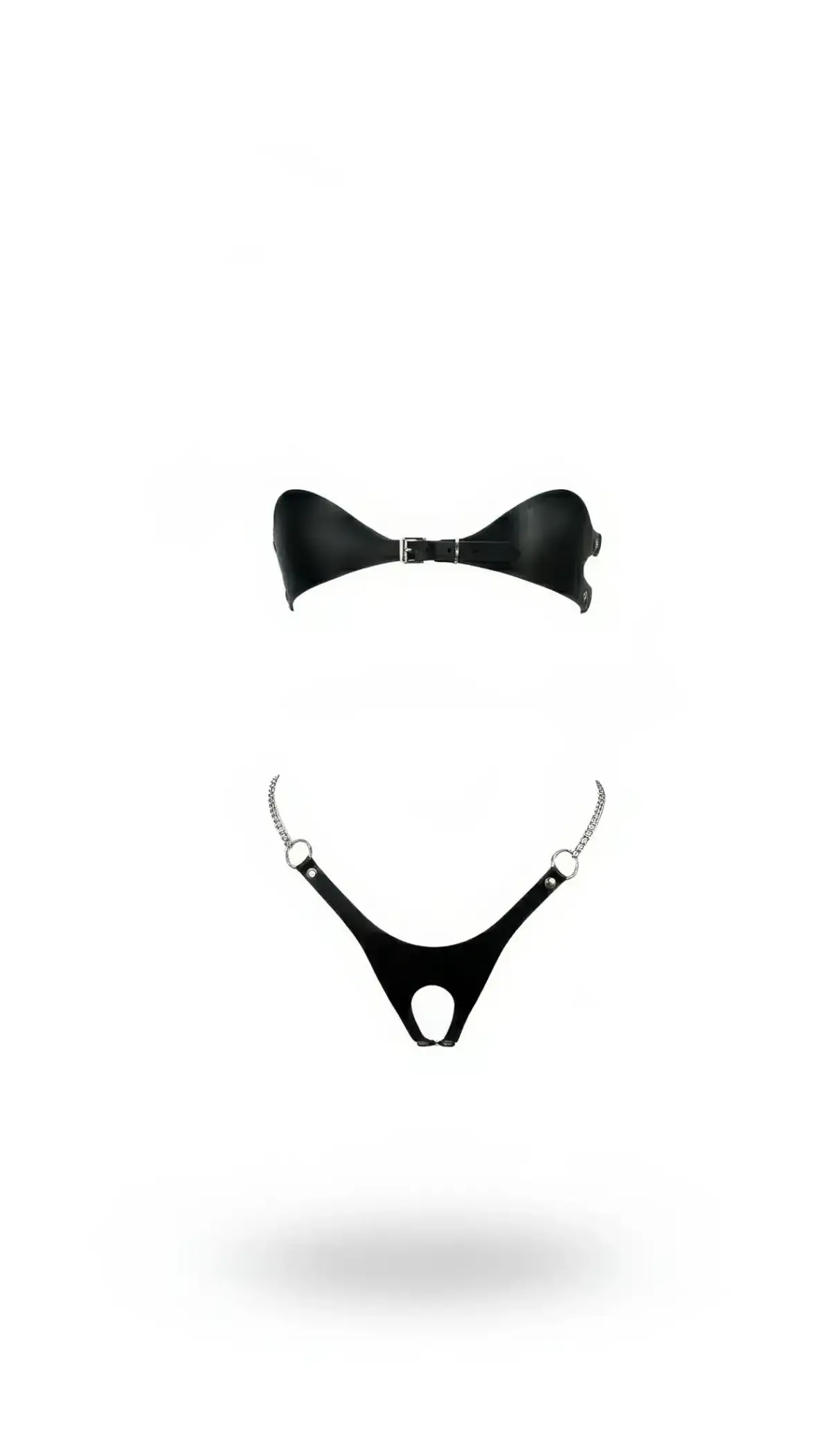 Unleash your provocative side with this stunning Black Harness Set, meticulously crafted from sleek, matte faux leather. The two-piece ensemble features a structured bralette and a matching bottom set, instantly adding an edgy dimension to your intimate apparel collection. Notice the striking visual contrast created by the polished silver O-rings and draping chain detail, which emphasizes the body’s silhouette. This luxurious bralette bottom set offers a commanding, yet comfortable, feel.
