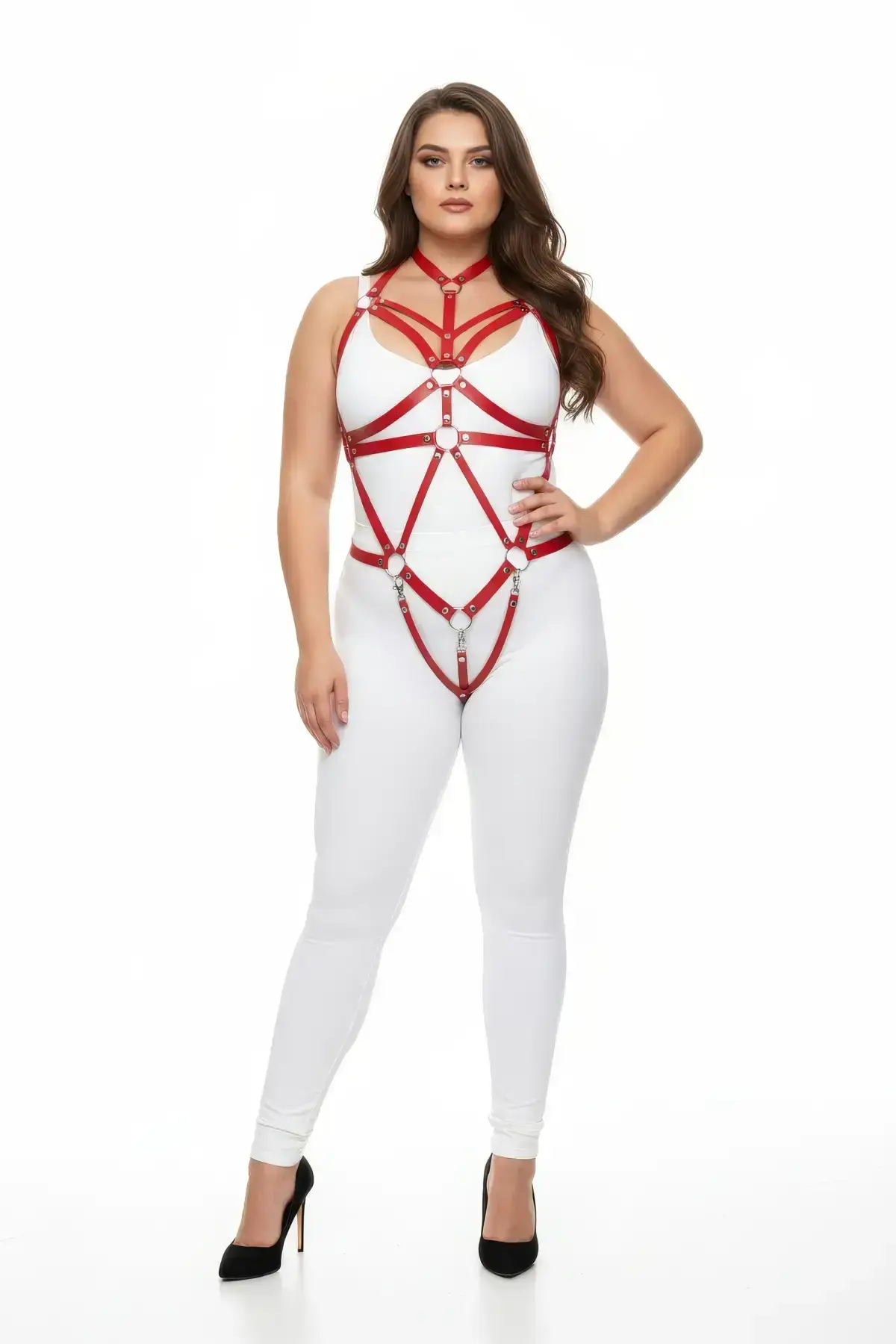 Make a powerful, unforgettable statement with the extraordinary Plus Size Red Women’s Harness Set. This vibrant, eye-catching accessory, rendered in a striking red hue, is expertly crafted from smooth, premium faux leather. The design features a bold multi-strap configuration that elegantly criss-crosses the torso, highlighting your natural shape. Prominent silver-tone O-rings connect the straps, adding a distinct, edgy geometric flair. This set is the ultimate statement piece for festivals, nights out, or as an alluring addition to your existing Body Harness collection.
