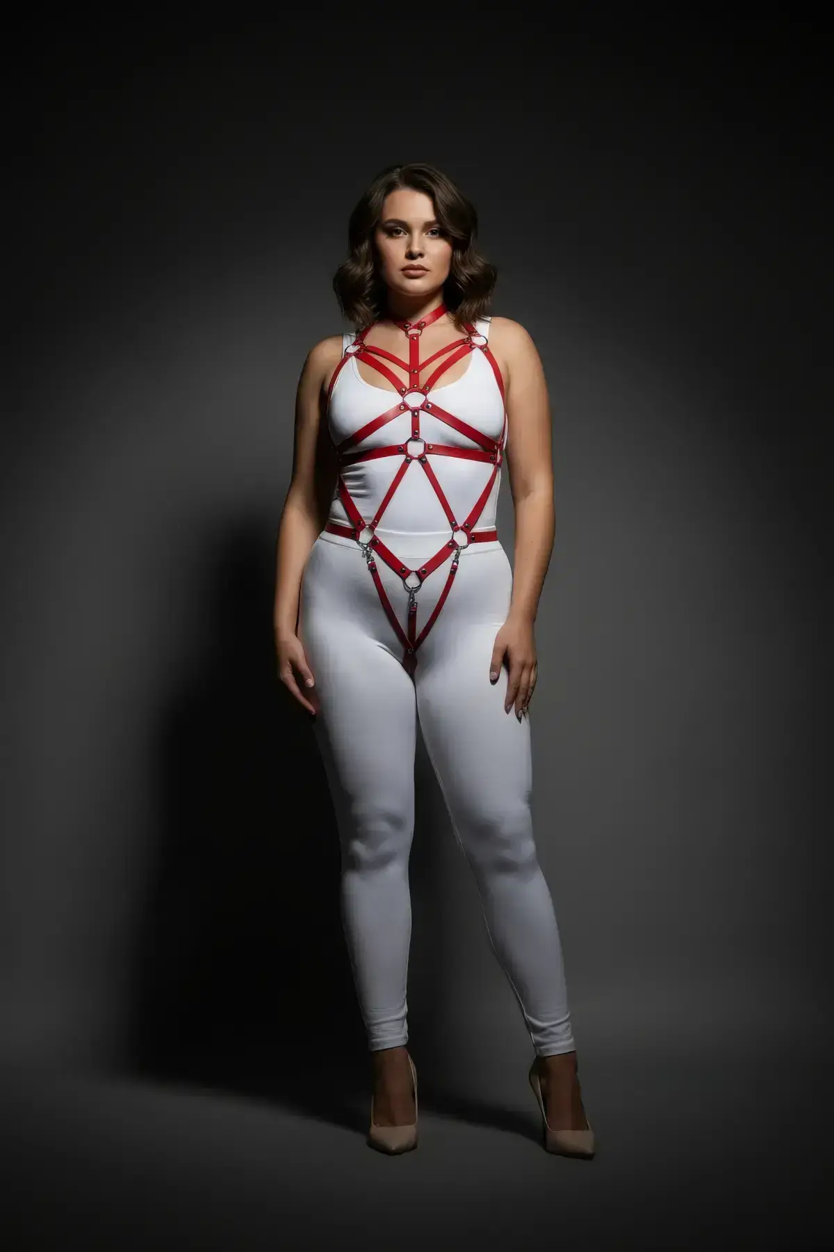 Whether you are looking for a playful addition to your erotic lingerie accessory wardrobe or a dramatic piece of outerwear, this set delivers unmatched impact. The high-contrast red material and silver ring detail ensure you capture attention. Combine this unique piece with a simple outfit for instant transformation or pair it with coordinating items for a complete look. Explore our range of Chest Harness designs to find more striking statement pieces and enhance your bold aesthetic.