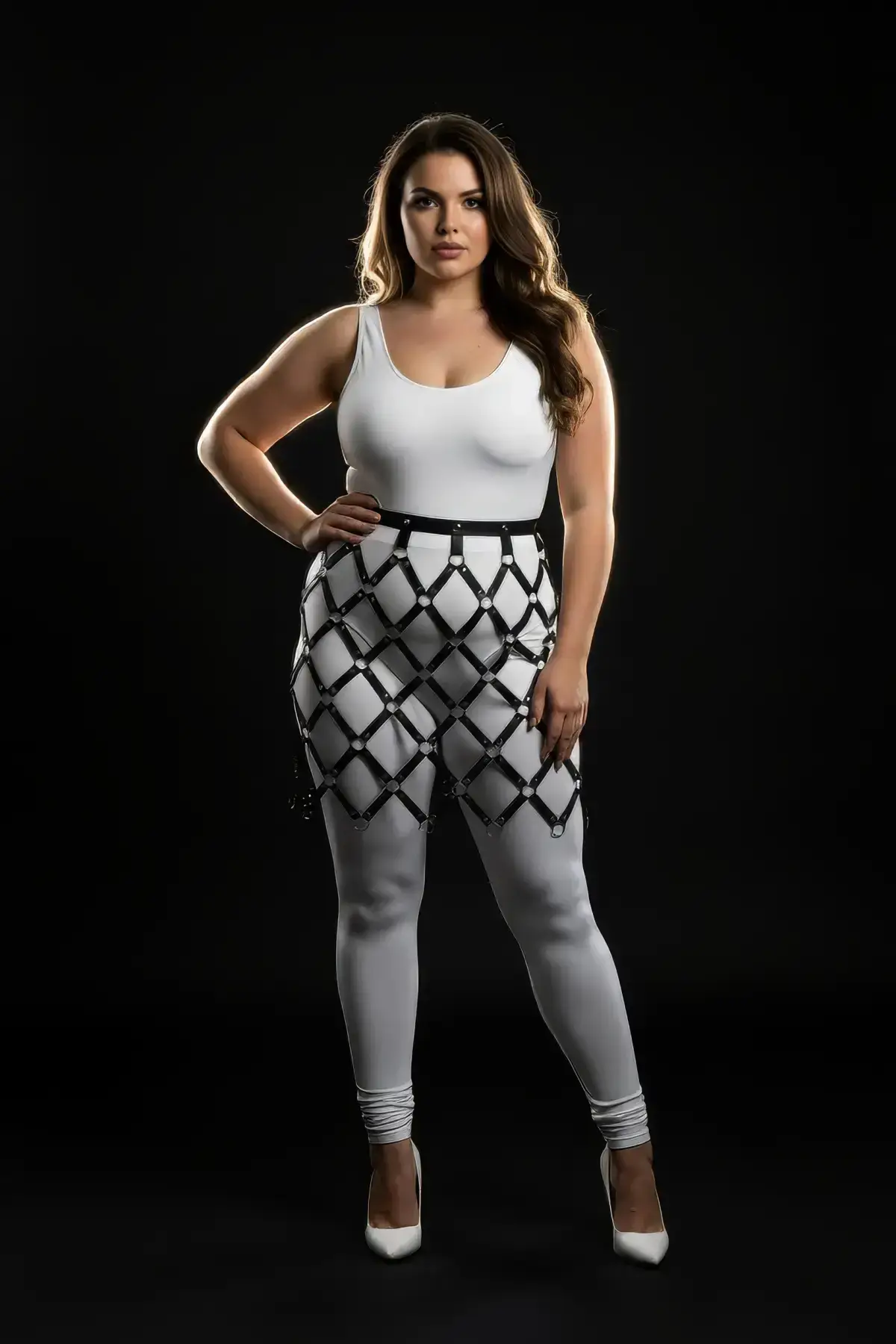Unleash your ultimate alter ego with the stunning Plus Size Black Skirt Harness, a powerful fusion of high fashion and fantasy. This piece is meticulously crafted from a premium matte black, leather-look material that perfectly drapes into an edgy A-line shape, as clearly visible in the product image. The high-waisted design cinches the silhouette, while multiple vertical and thigh straps are punctuated by striking silver-toned metal ring details, lending a distinct, fetish-inspired aesthetic. This is more than just a skirt; it’s a complete statement piece built for confidence and curve-flattering style.