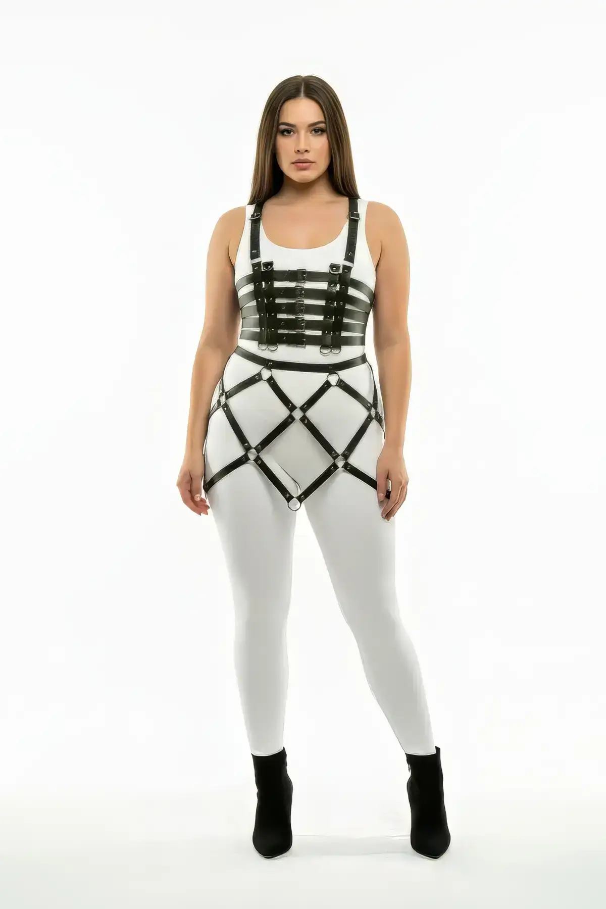 The defining visual detail of this set is the carefully constructed cage detail. Unlike simple belts, this harness uses thick, uniform straps to create a three-dimensional, architectural effect. It is a crucial fashion accessory that transforms a simple skirt into a showstopper. Combine this bold look with other complementary items like a Chest Harness for a complete aesthetic. Always consult the detailed sizing chart to ensure the perfect fit for this Plus Size Black Skirt with Cage Detail Leather Harness Accessory. This meticulous craftsmanship ensures durability and long-lasting style.