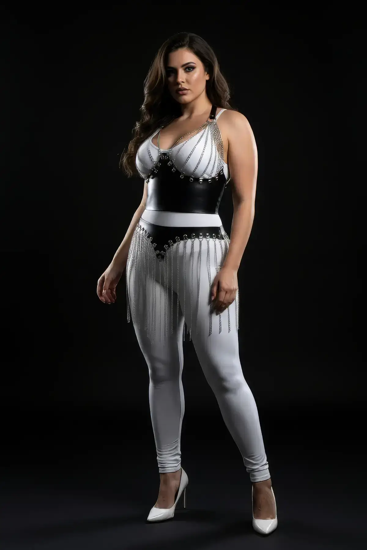 Versatility is key with this must-have item. Pair this dramatic piece with a simple crop top and our matching Chest Harness for an unforgettable club look. If you prefer a full ensemble, explore our curated selection of Harness Set to complete your aesthetic. This Plus Size Black Skirt is the perfect base for your next elevated outfit, offering a dynamic and playful **chain fringe** element. Don’t forget to check out our collection of Choker accessories to amplify your ensemble.