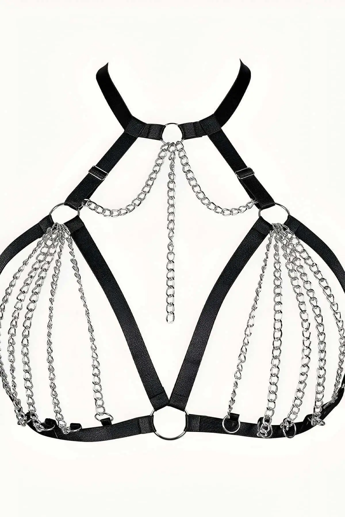 Experience the seductive fusion of structure and fluidity with the Chain Elastic Sexy Breast Harness. This striking piece instantly elevates your wardrobe by pairing durable, wide black elastic with cascading, delicate silver-toned chains. The visual effect is a mesmerizing crossover design that forms a stunning elastic cage over the breasts, making it a powerful piece of body jewelry. Perfect for those seeking to make an undeniable fashion statement, the elastic ensures a comfortable fit while the high-quality metal components provide a luxurious shimmer.