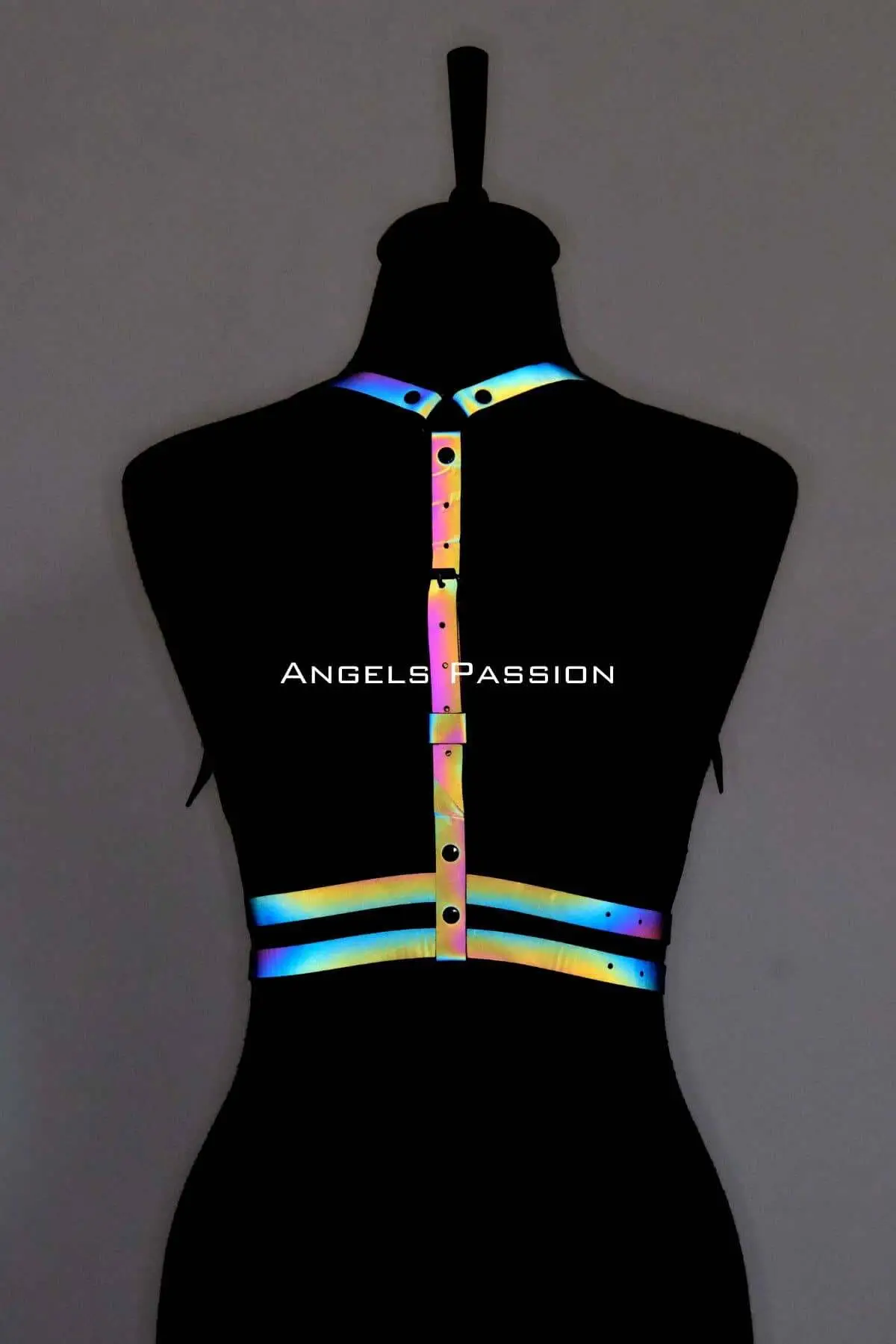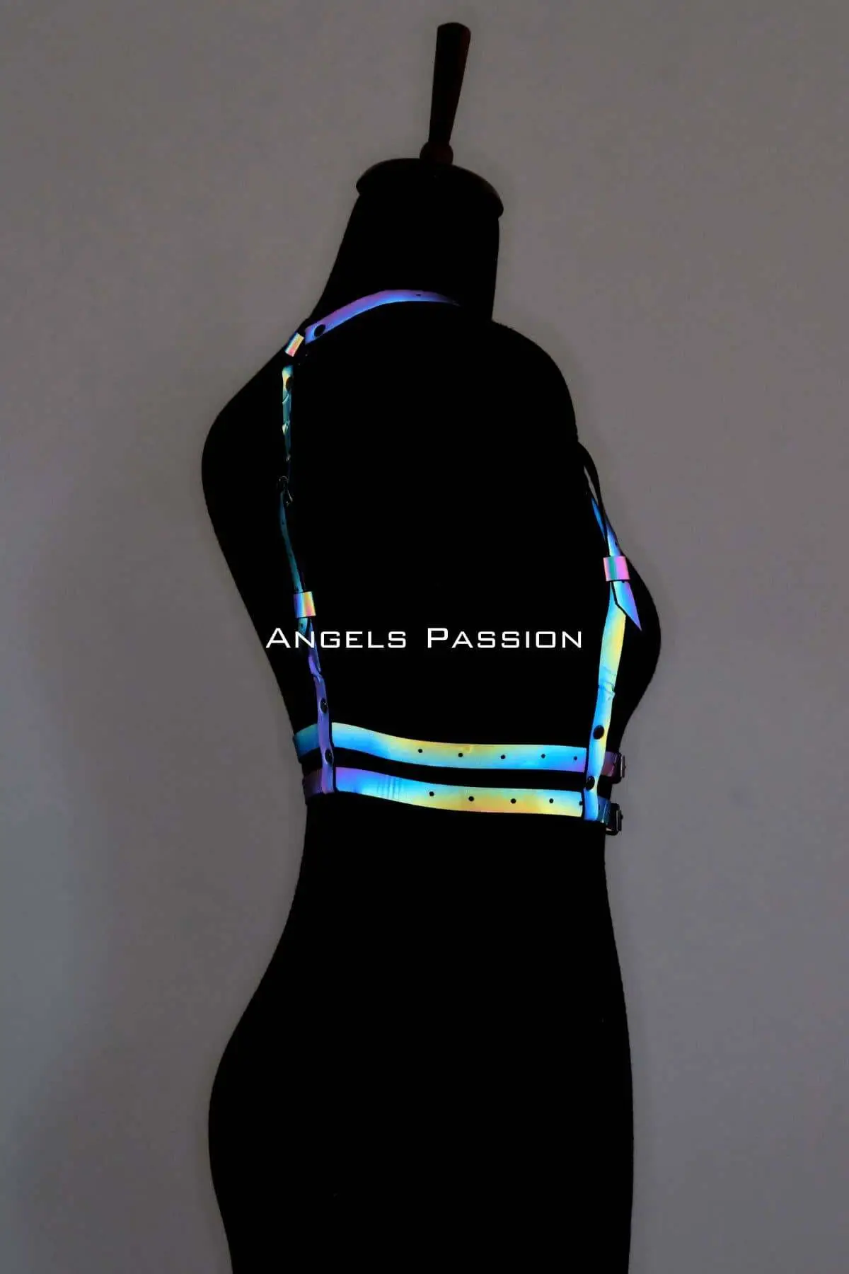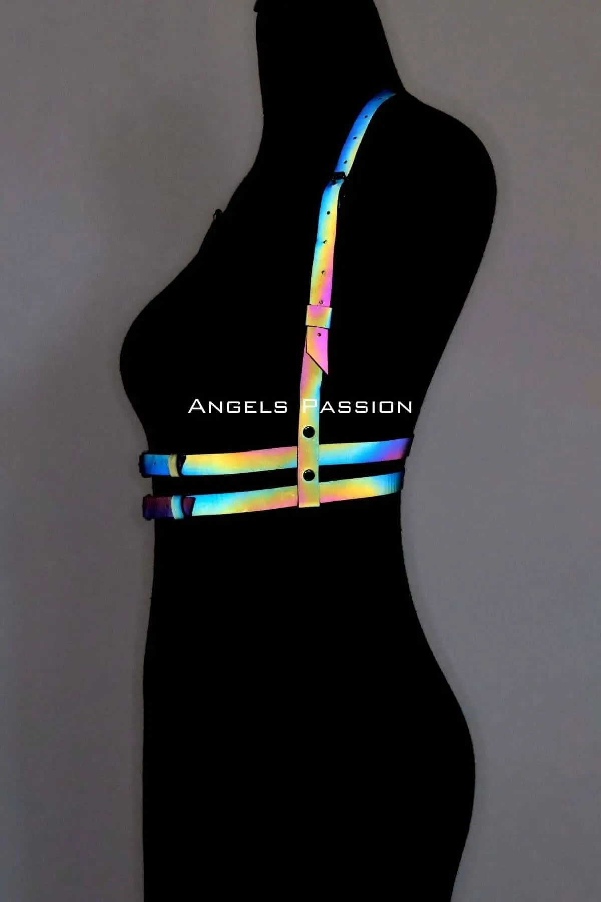 Introducing the ultimate nightlife accessory, the Colorful Reflective Chest Harness. This striking piece of **rave gear** features a lightweight, woven webbing material that appears light silver-grey in standard light but immediately explodes into an iridescent, vibrant spectrum of pinks, blues, and purples when illuminated by a camera flash or spotlight. The product image clearly shows this dazzling holographic design effect against a dark background, instantly elevating your festival fashion look. This isn’t just an accessory; it’s a statement of bold style and maximum visibility.