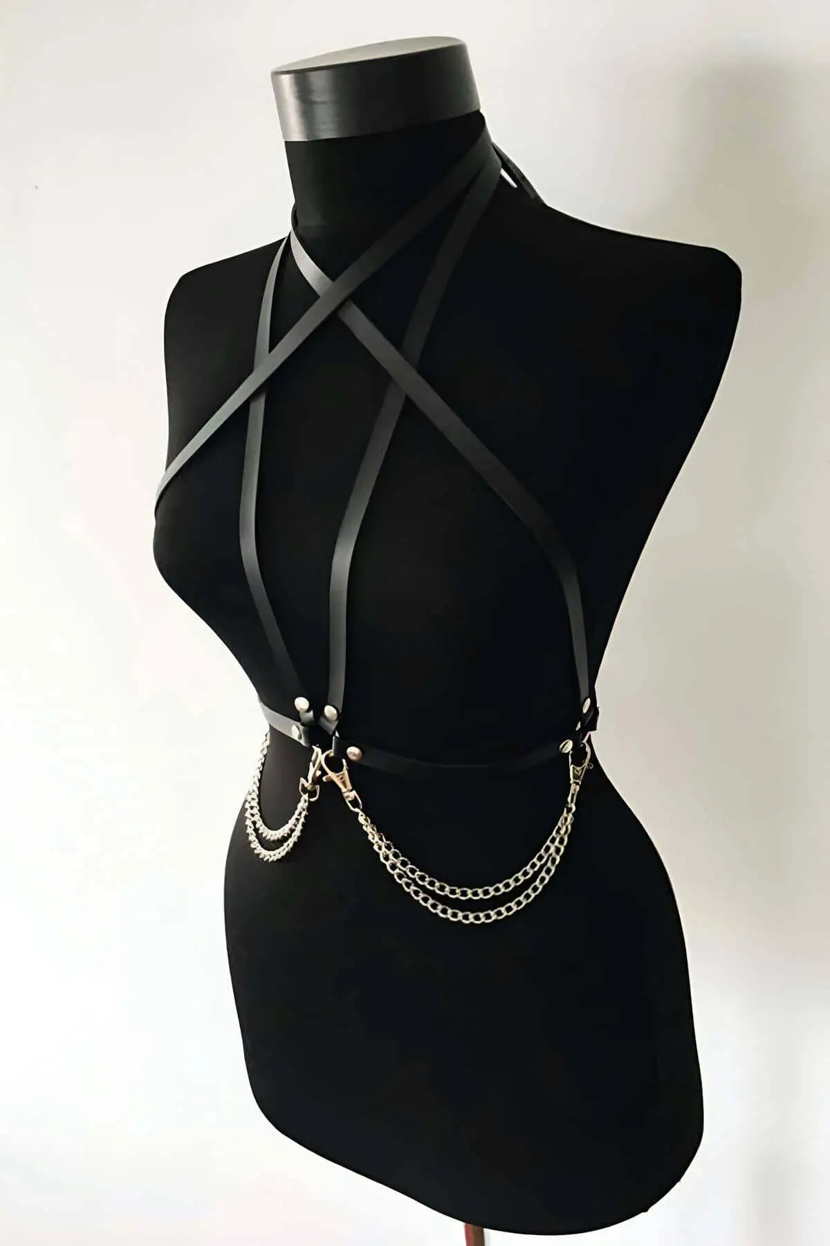 Command attention with the Custom Made Leather Harness, a striking accessory piece designed for a truly personalized silhouette. This intricate black strap system, visible in the product image, features a complex arrangement of high-quality material forming a captivating torso geometry. Secured by multiple silver-tone adjustment buckles and accented with bold metal O-rings, this Leather Chest Harness is the epitome of edgy fashion. Crafted to provide a bespoke fit, this body accessory molds perfectly to your form, enhancing any outfit from minimal lingerie to an oversized shirt.