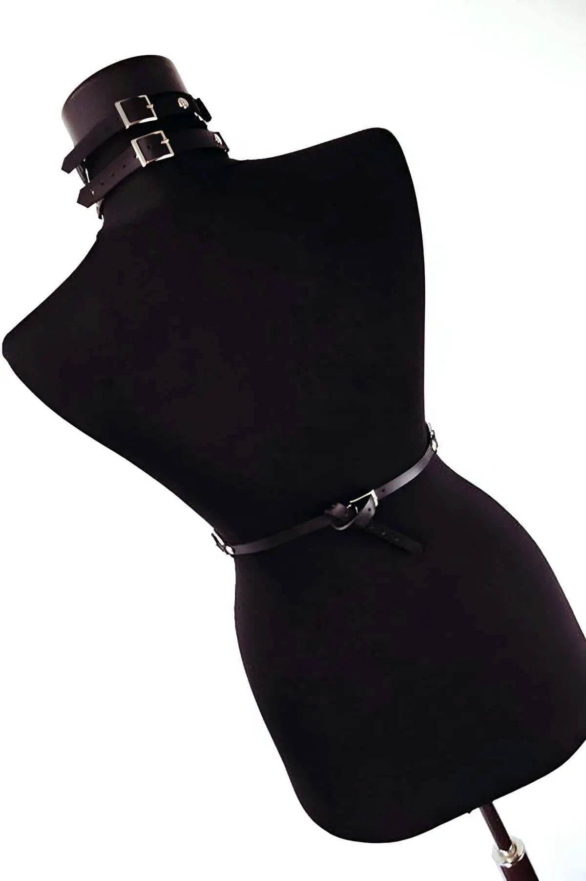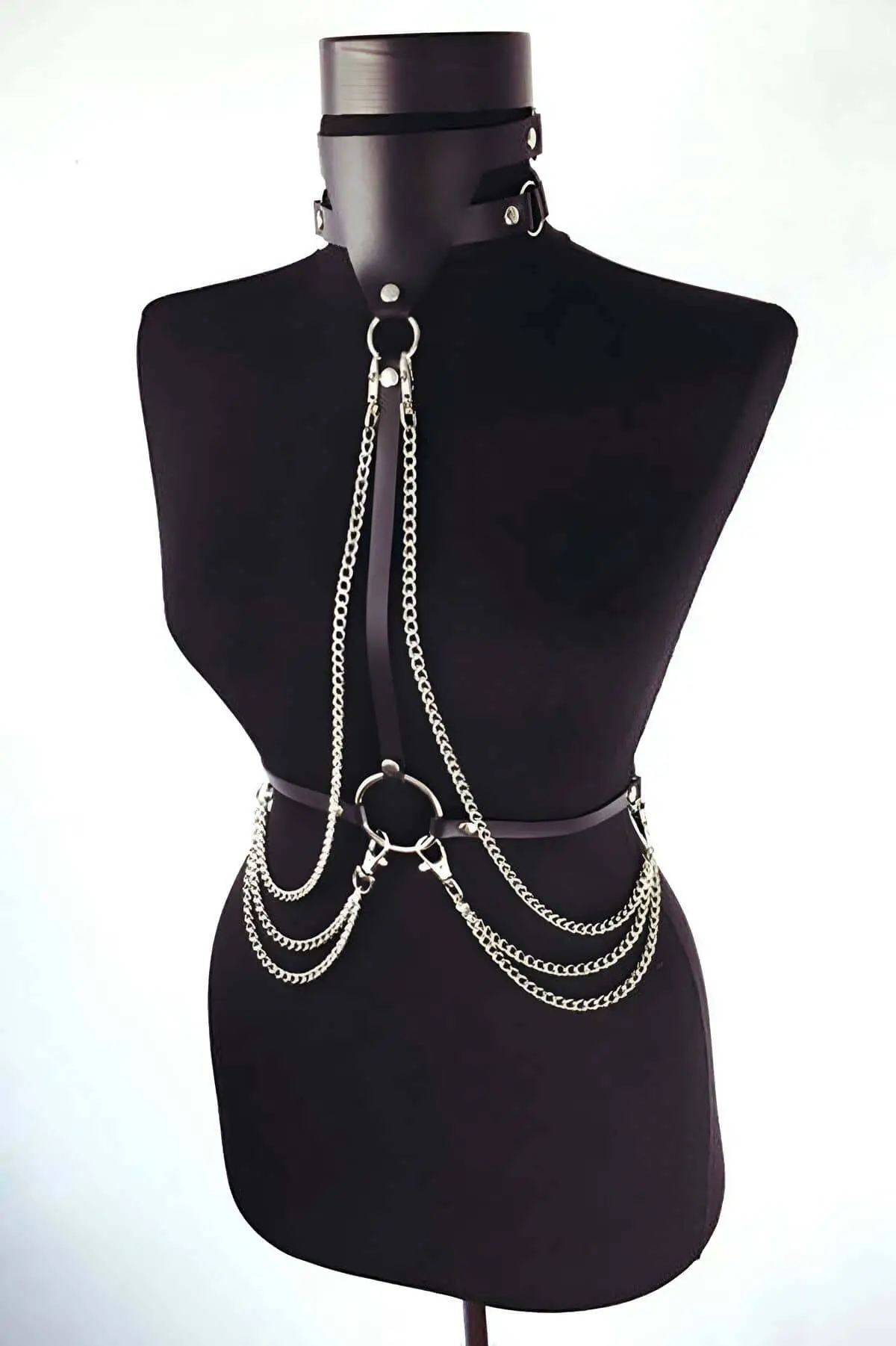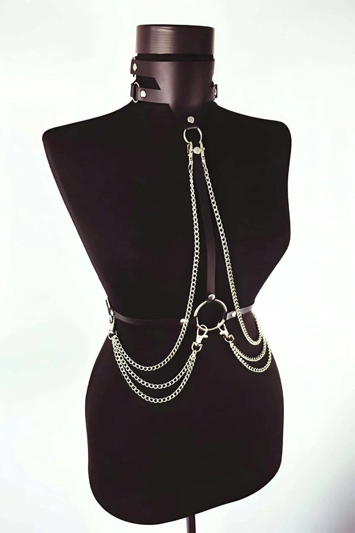 This Custom Made Leather Harness is the epitome of meticulous craftsmanship, designed for those who value superior construction and a truly personalized fit. The robust straps are secured with durable metal rivets, ensuring longevity and maintaining the striking silhouette. The strategic placement of the silver hardware allows you to easily adjust the fit at multiple points, accommodating various body types and layering styles. Whether you are aiming for a subtle accent over a shirt or a bold statement piece for evening wear, the adjustable design ensures comfort and a perfect contour every time. Pair it with a simple black Choker for a complete, edgy look.