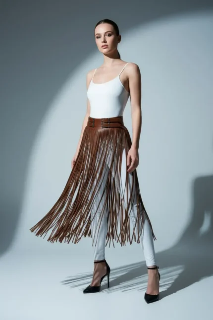 Kahverengi Püsküllü Yüksek Bel Deri Etek SH1090
