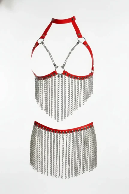 Zincir Detaylı Kırmızı Suni Deri Mini Etek SH504