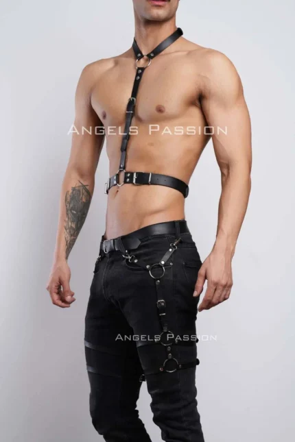 47,9 $Siyah Deri Metal Halkalı Erkek Göğüs ve Bacak Jartiyer Harness Takımı SHM202
