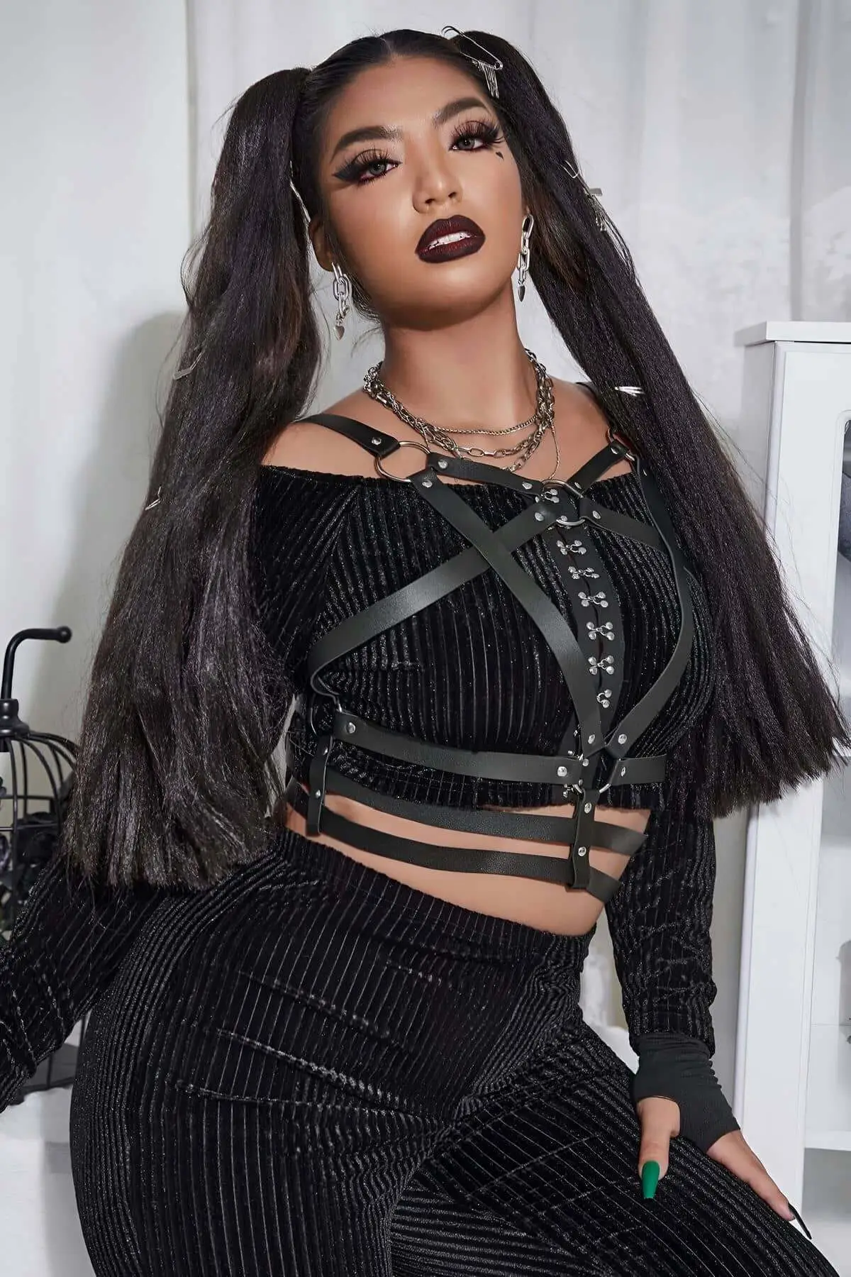 Unleash your inner confidence with the captivating Fantasy Leather Chest Harness, a meticulously crafted Women’s Harness designed for statement-making style. This intricate piece features bold, black faux leather straps that create an arresting, structured shape around the torso and bust. The design highlights a central large O-ring, connecting the vertical and horizontal straps, perfectly framing the overbust area. Every strap is fully adjustable, allowing you to customize the fit for maximum comfort and dramatic visual impact, making this more than just an accessory—it is an adjustable body cage that redefines your silhouette.