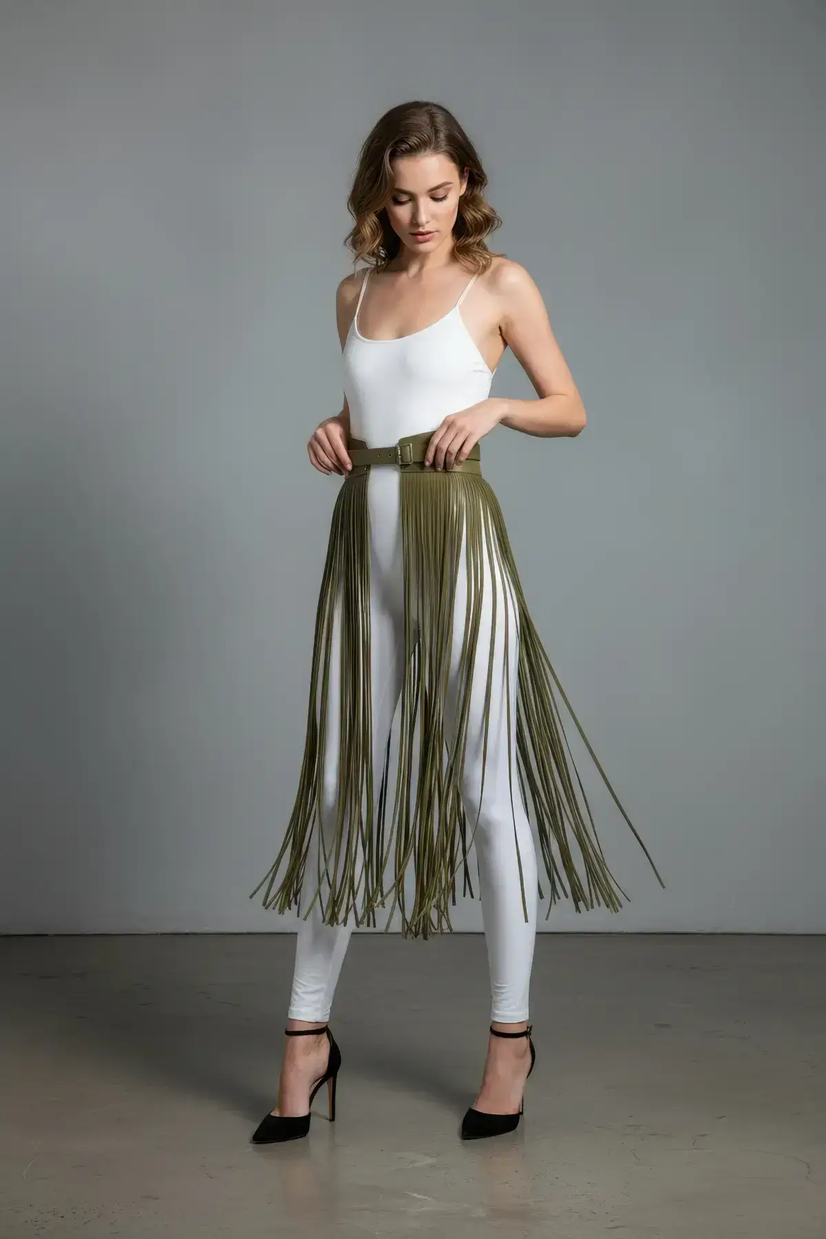 The attention to detail in this design ensures maximum impact and comfort. The wide, supportive waistband provides a flattering, elongated silhouette, making this the perfect piece to pair with a cropped top or one of our curated Body Harness selections. The fringed panels are meticulously cut to guarantee beautiful flow and drape, confirming this is a truly unique Leather Skirt alternative in the popular vegan leather/suede category. This Khaki Skirt brings a confident, bohemian edge to any ensemble, proving that ethical materials can deliver high-impact style.