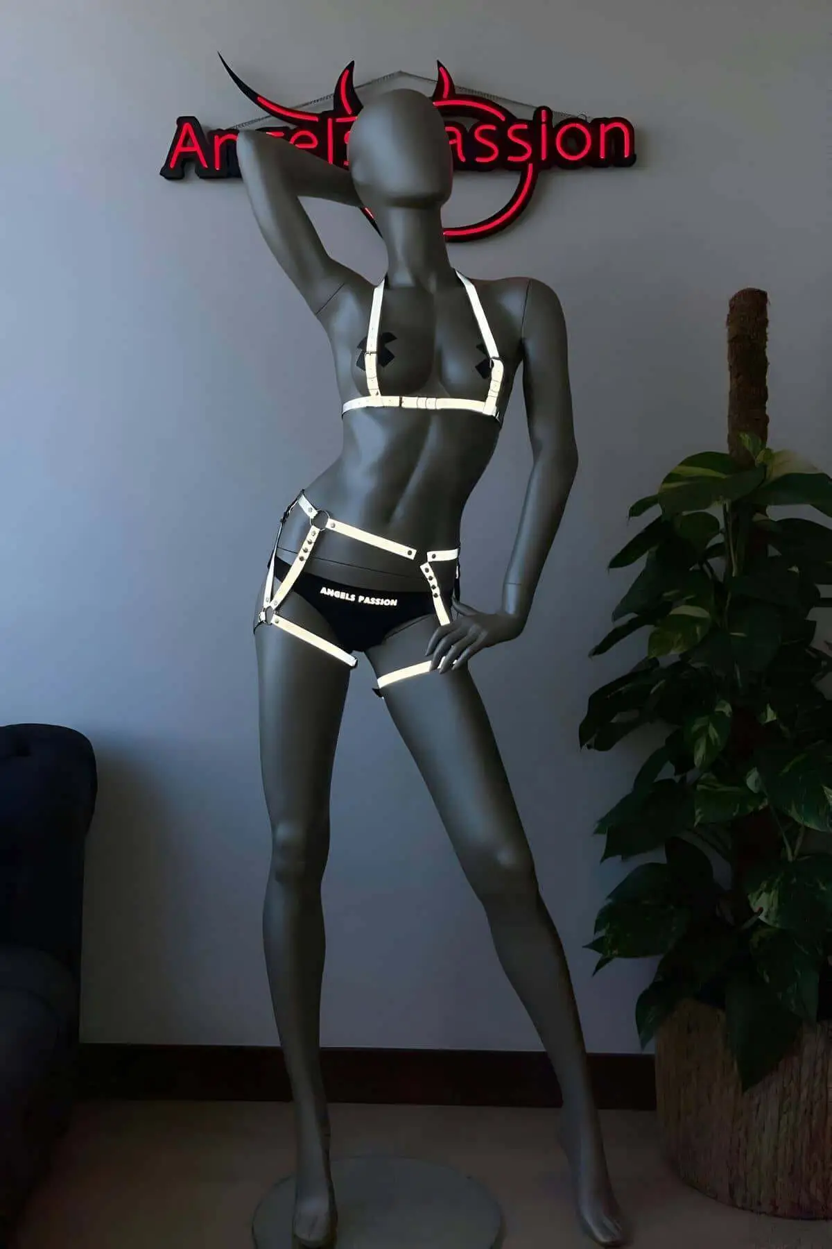 The ultimate statement piece, this Reflective Harness instantly transforms any look. The design features dark, durable webbing material crisscrossing the torso, dramatically wrapping the waist and hips. A high-contrast silver or bright stripe runs the entire length of the straps, designed to brilliantly catch and reflect light in dark environments. This specific hip-wrapping structure emphasizes your silhouette, creating an unforgettable cyberpunk-inspired aesthetic when worn over a simple top and shorts, just as visible in the product image.