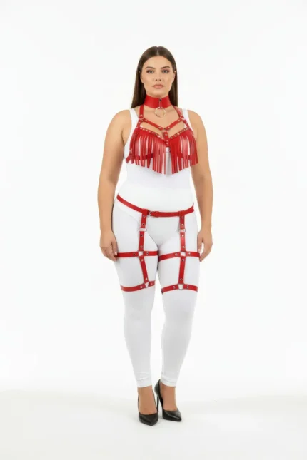 54,9 $Plus Size Red Women’s Leather Harness Set with Tassel Detail and Garter Belt – SH715