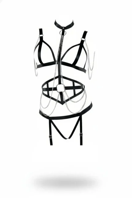 Black Harness Set with Chain Detail, Choker Neckline and Garter Belt – SH299