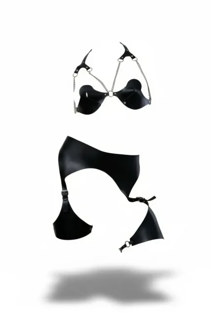 Black Harness Set with Chain Detail, Faux Leather Bralette Set – SH1220