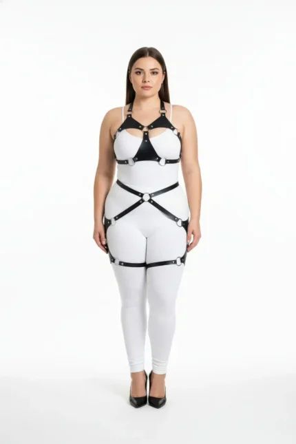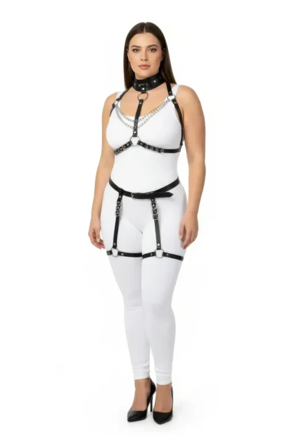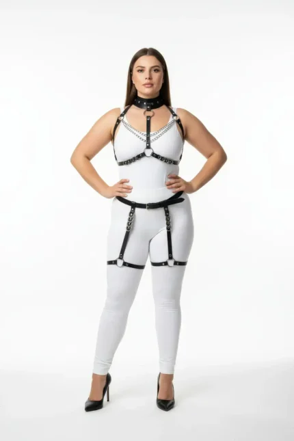 39,9 $Plus Size Black Women’s Leather Harness Set with Chain and Ring Details and Garter Belt – SH1081