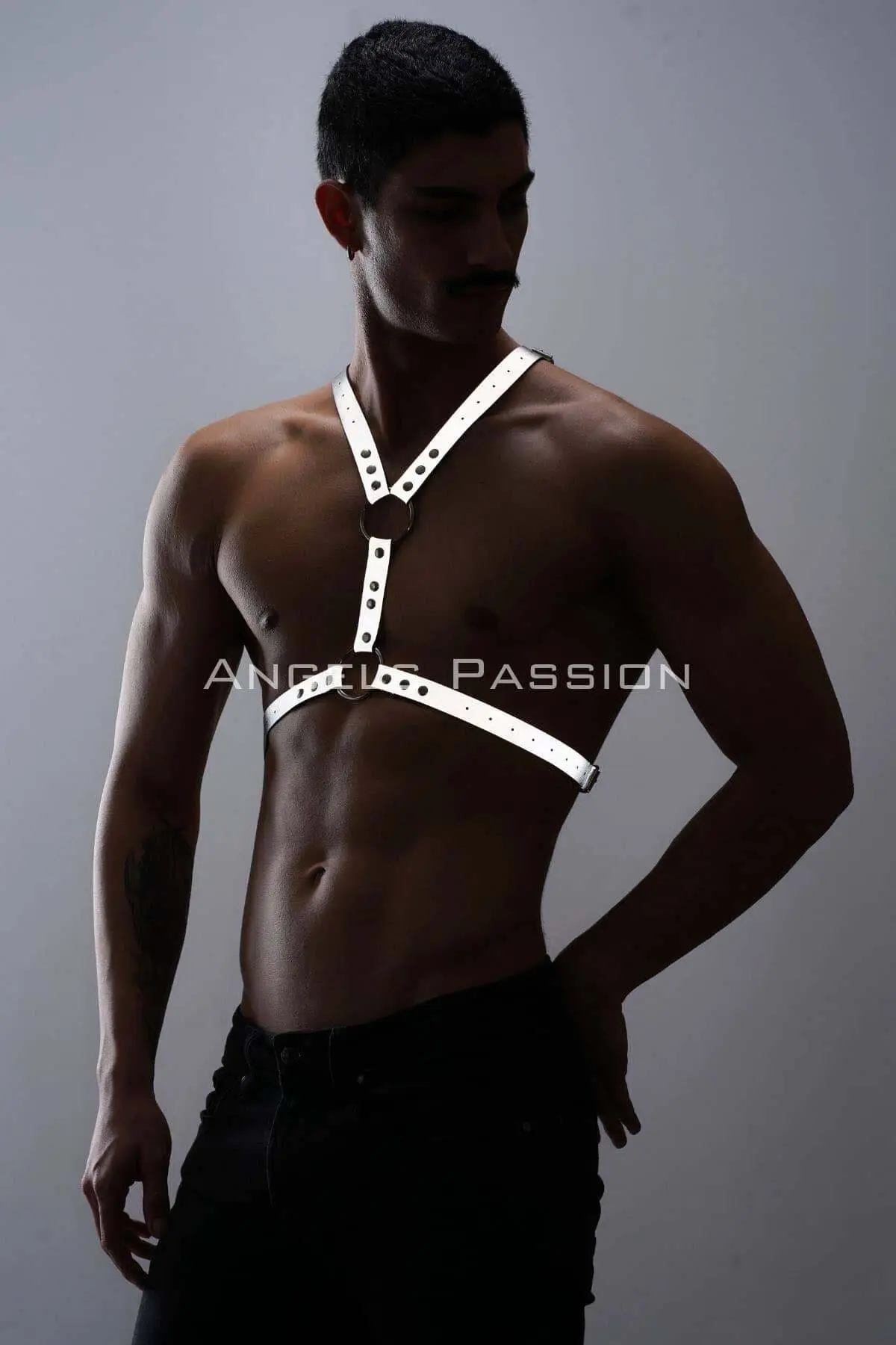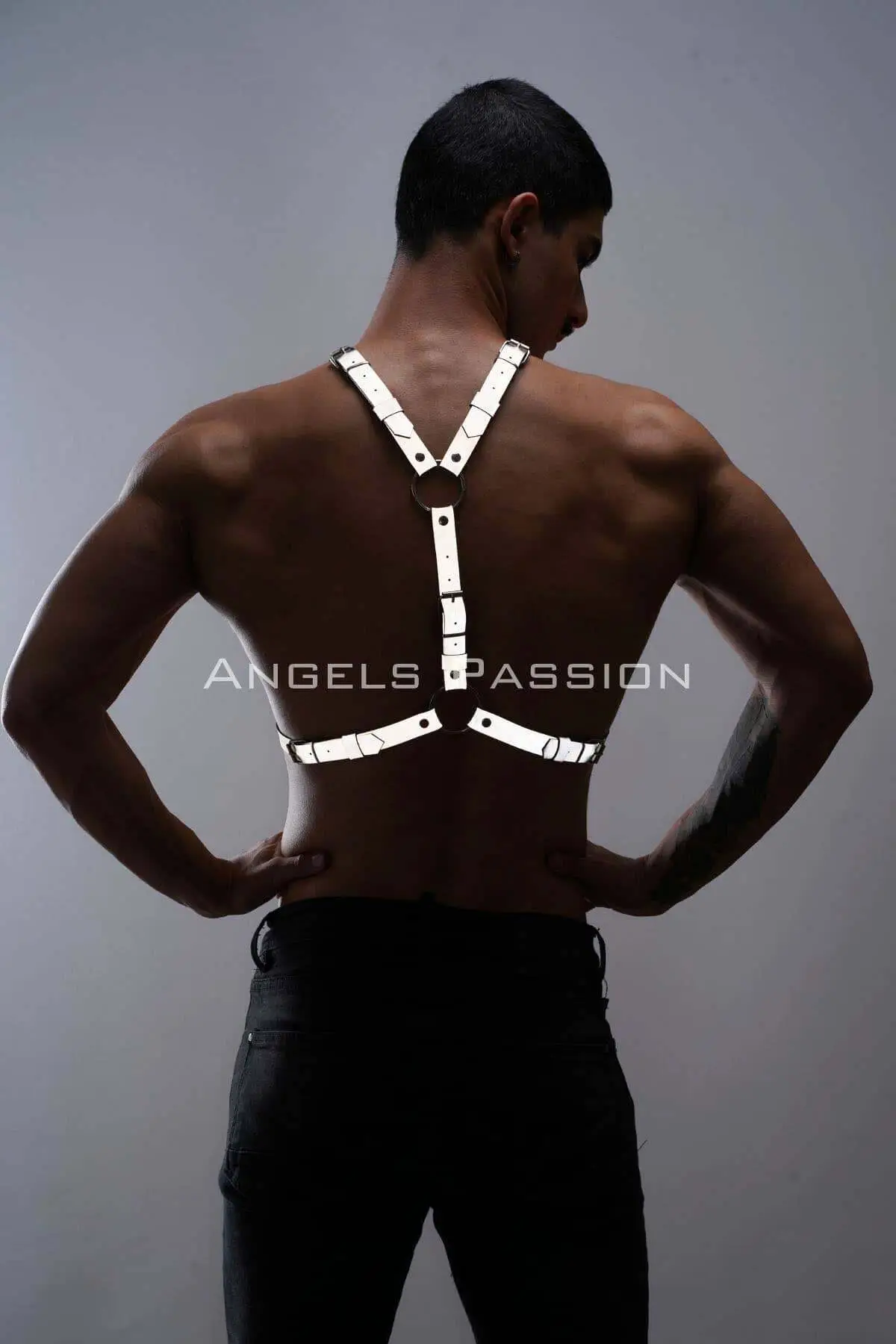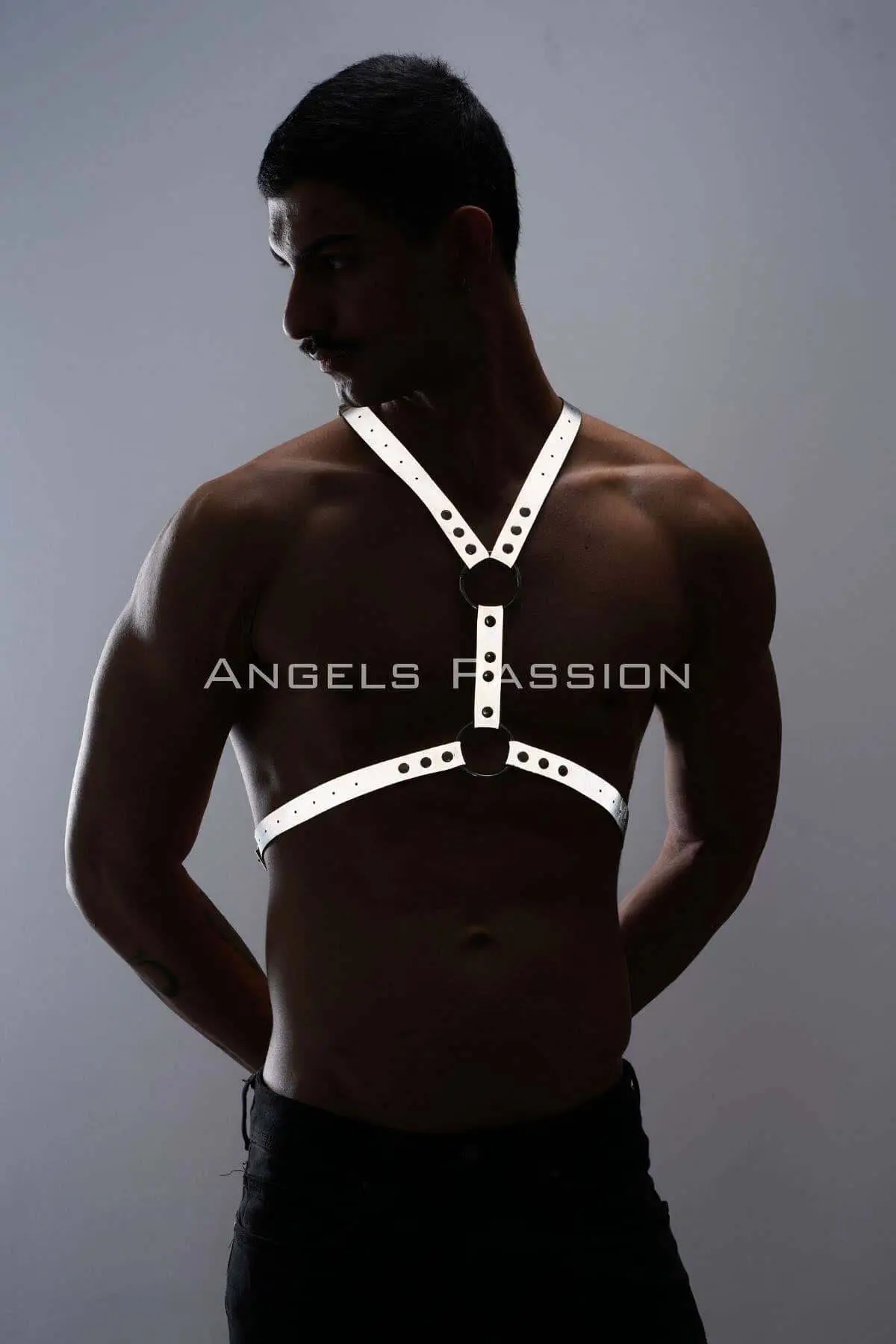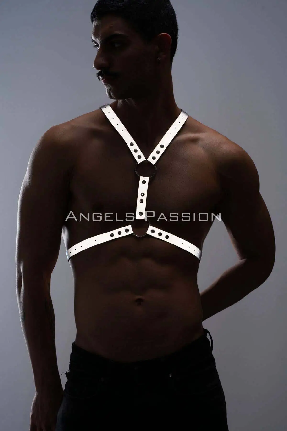 Crafted from a specialized, premium reflective material, this chest harness is a masterpiece of modern fetish and clubwear design. The fabric is meticulously constructed to illuminate dramatically under direct light, creating an unforgettable, futuristic glow-in-the-dark effect that is perfect for low-light environments like raves, dance clubs, and exclusive parties. Each strap is fully adjustable, allowing you to sculpt the perfect, body-hugging fit that highlights your masculine physique with authority and seductive precision. This is handmade excellence for the discerning wearer.