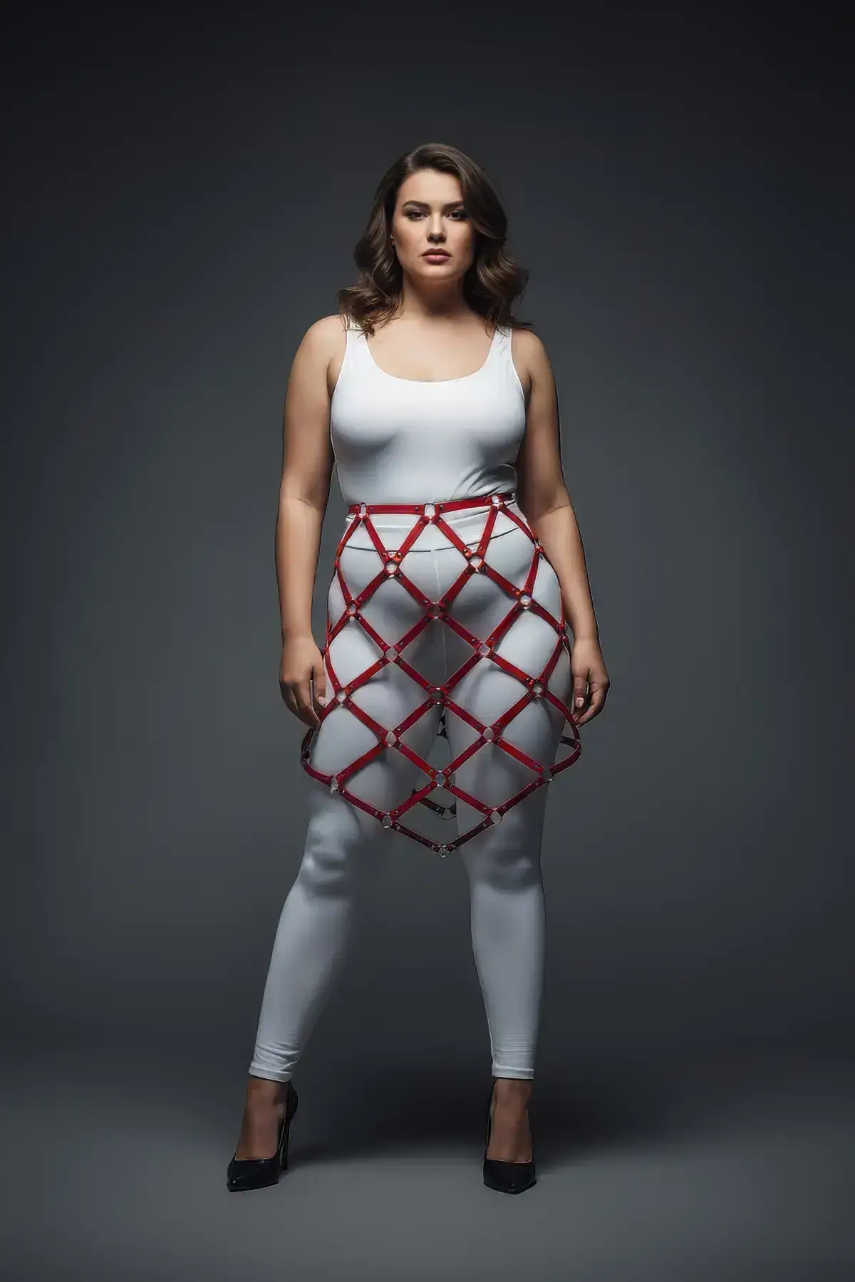 Unleash bold confidence with the striking Plus Size Red Leather Skirt Harness, a true statement body accessory. This stunning piece is crafted from a vibrant, smooth, deep red material that catches the light with a glossy, leather-look finish. The high-waisted design features a wide cinching belt section that flows into an intricate, architectural cage mesh design over the hips and upper thighs. Its structured appearance and intense color make it an unforgettable addition to any outfit, instantly transforming casual wear or elevating your sensual apparel. The meticulous craftsmanship ensures this piece remains comfortable while providing that coveted, visually arresting silhouette.