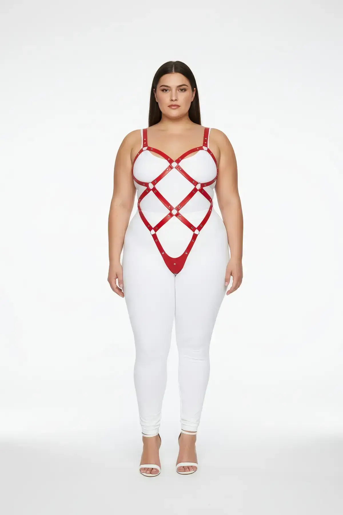 Unleash your inner confidence with this magnificent Plus Size Red Women’s Full Body Harness Set, a striking body accessory designed for commanding attention. The vibrant, slightly glossy PU leather material and the intricate network of straps create a captivating high-waisted silhouette that naturally flatters every curve. Multiple straps converge at the central silver o-rings, extending down the body to frame the torso and legs. This is not merely a garment; it is a powerful piece of daring fashion designed specifically for the woman who owns her style and shape.