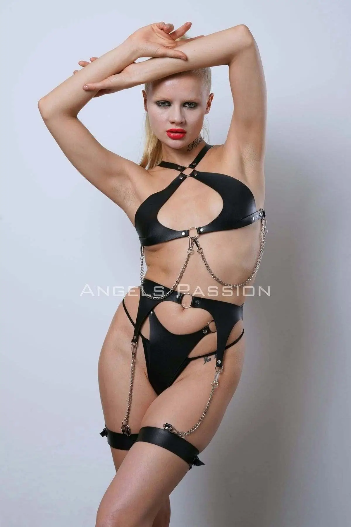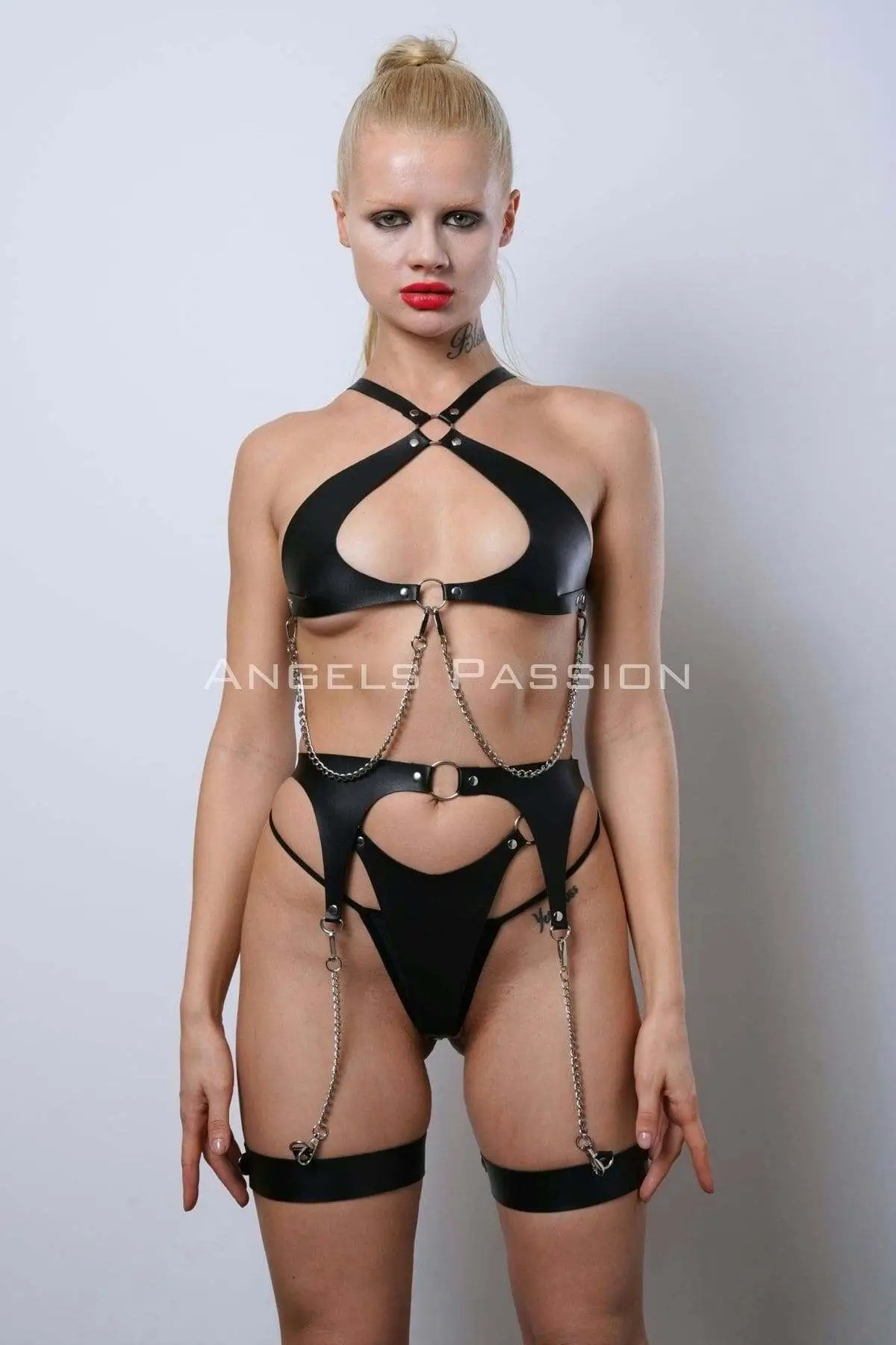 Leather Fantasy Lingerie Set, Stylish Leather Harness Set, Club Wear – SH1330