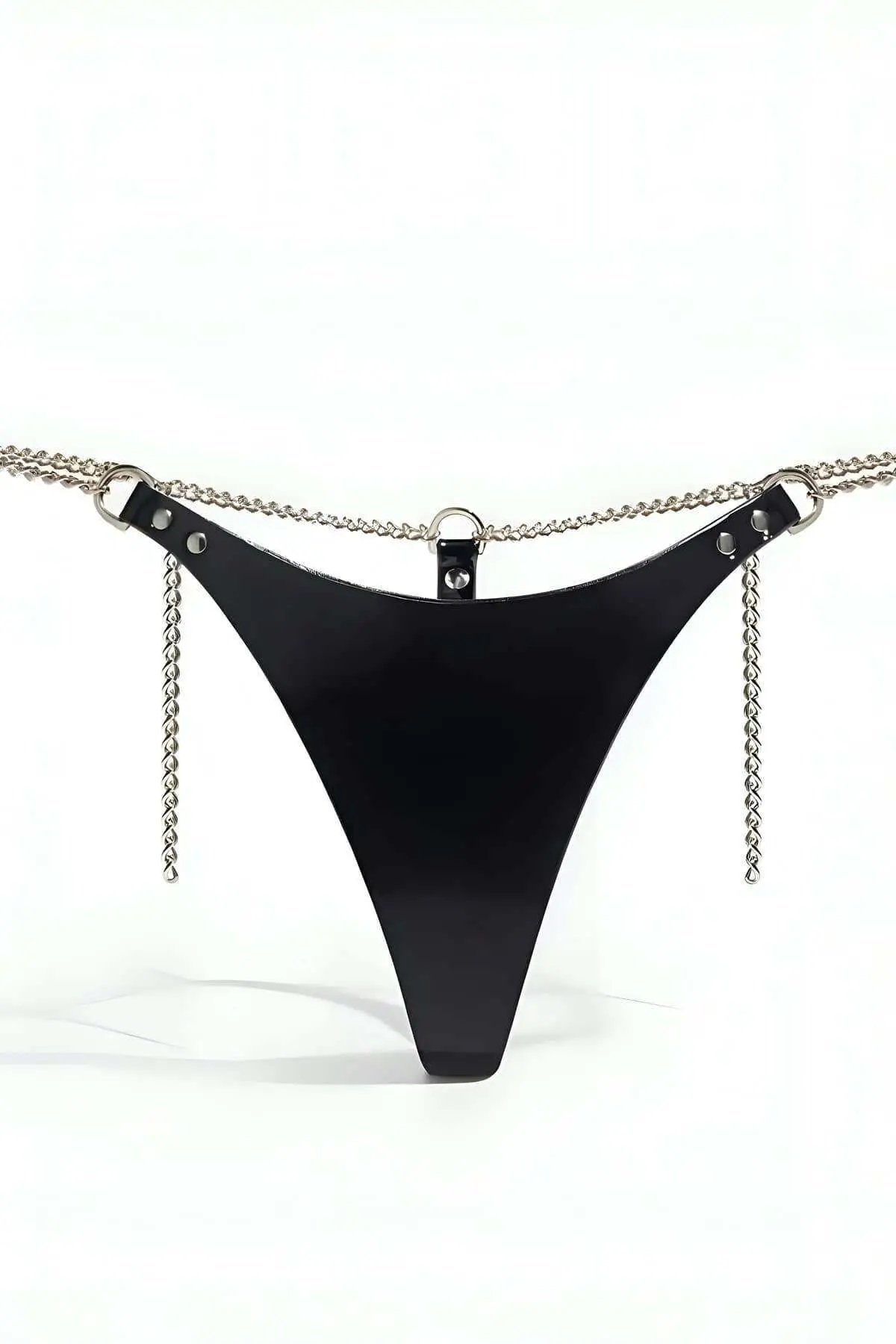 Attention to detail is paramount in the design of this piece. The secure attachment points for the chain ensure durability, while the flexible waist allows for an adjustable fit that moves with you. This **Minimalist Thong** proves that less is truly more, focusing all attention on the bold material and the striking metallic accent. Whether you are seeking a unique gift or treating yourself to a signature item, this garment perfectly balances avant-garde fashion with timeless sensual appeal. Prepare to make a statement with this uniquely designed harness thong.