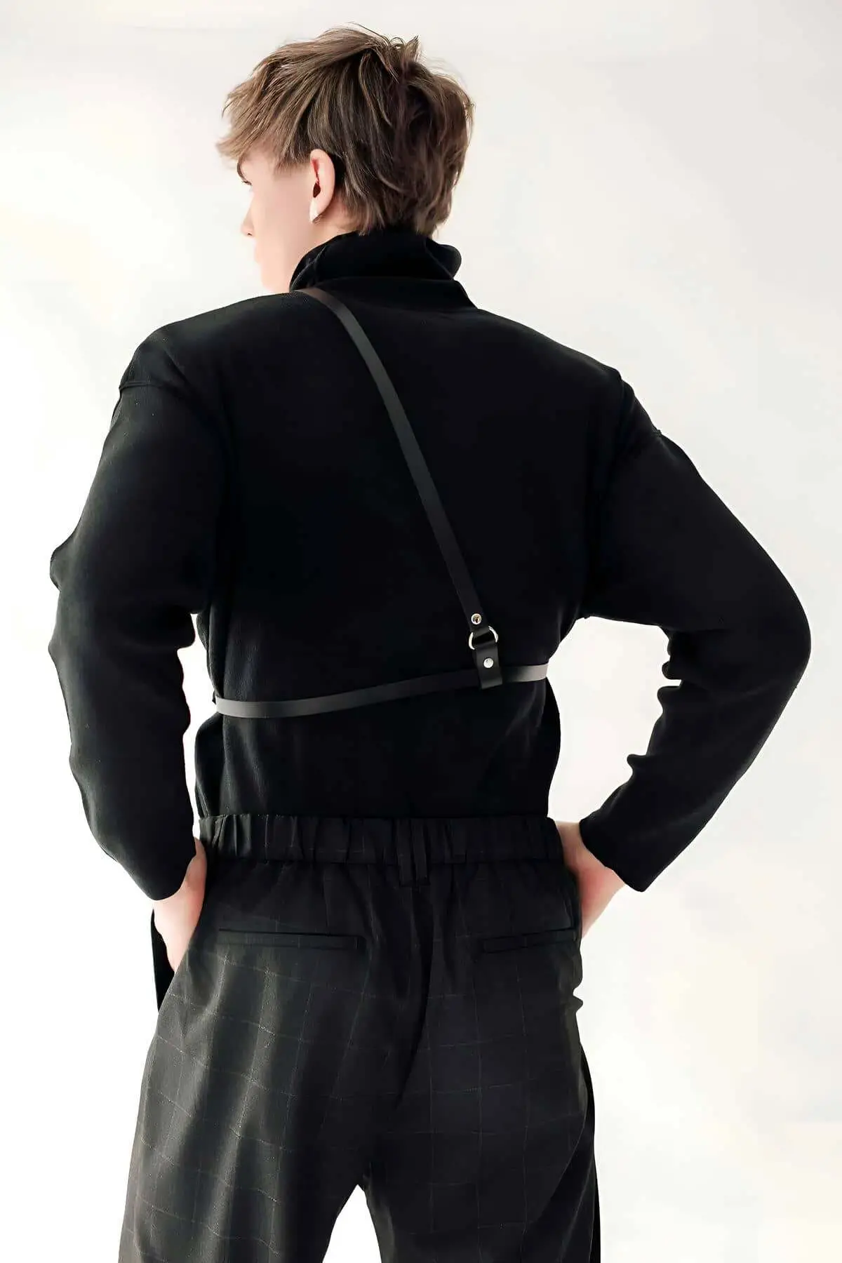 Hand-finished using superior-grade, supple leather, this accessory features robust, immaculate stitching and sleek, durable metal hardware. The design seamlessly integrates the functionality of a classic belt with the striking visual impact of shoulder suspension. Its symmetrical lines are engineered to accentuate the masculine form, ensuring a commanding, tailored fit that moves flawlessly with you, embodying the pinnacle of modern fetish fashion and style.
