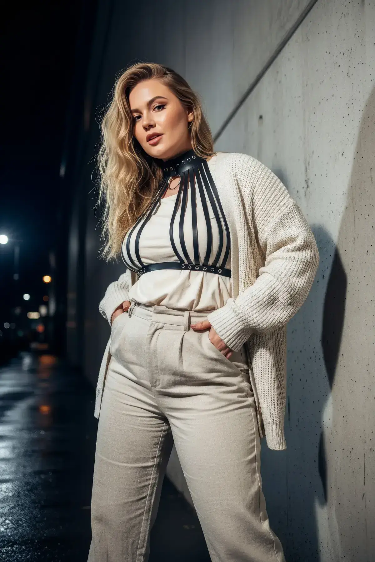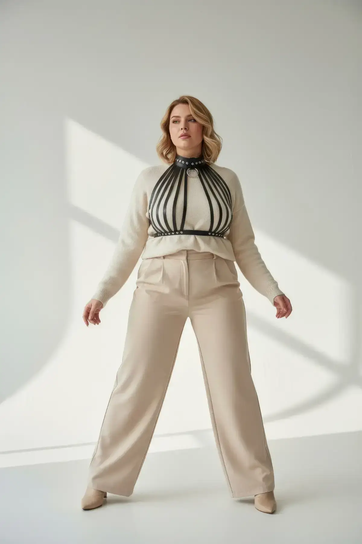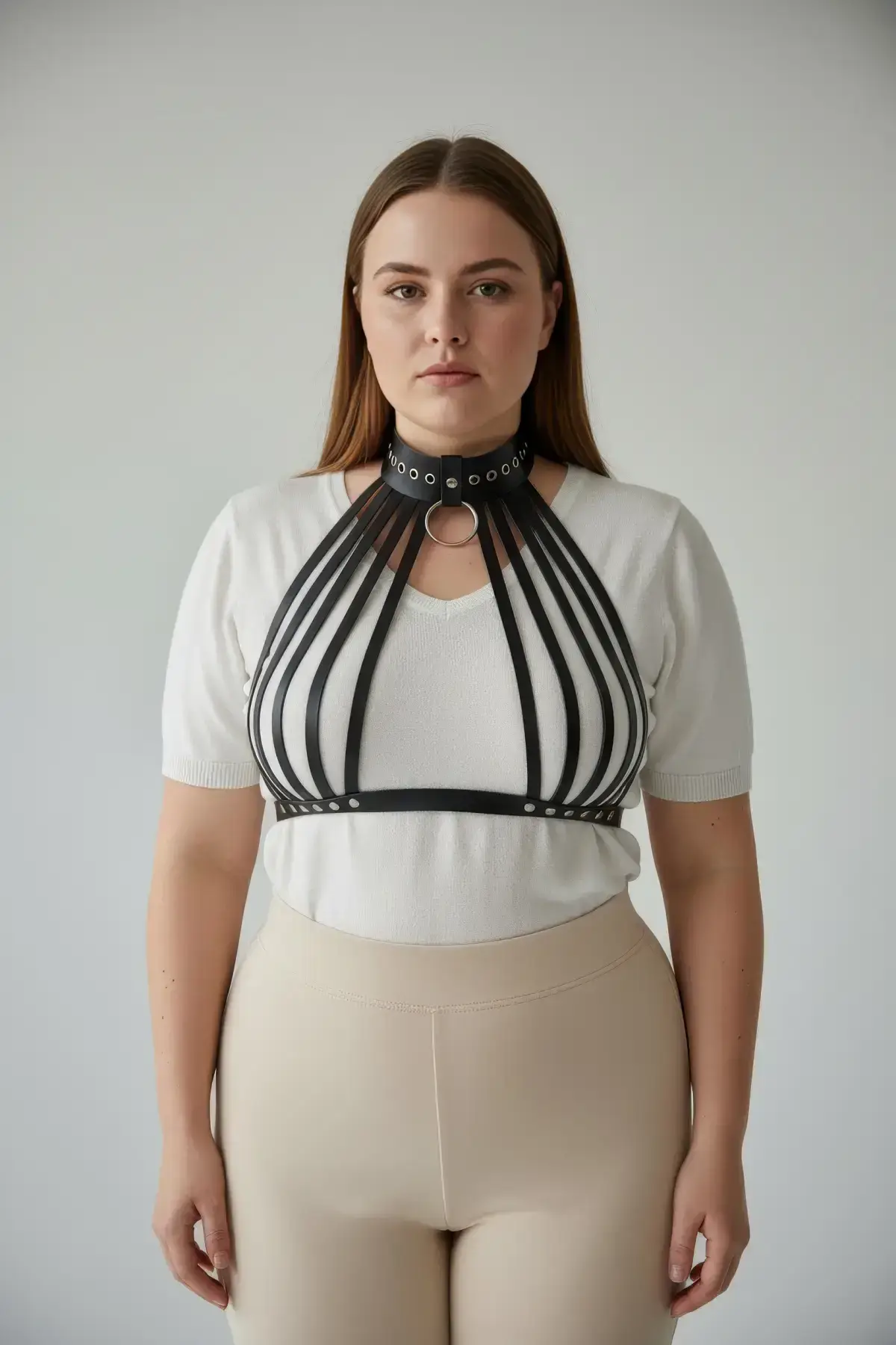 Forget uncomfortable accessories; this piece is crafted from premium faux leather that feels soft against the skin, offering comfortable all-day wear. The design features multiple adjustable straps, ensuring a perfect, customized fit that works with your unique shape. It’s an elevated alternative to a simple Women’s Belt and provides the dramatic structure of a full Body Harness without the complexity.