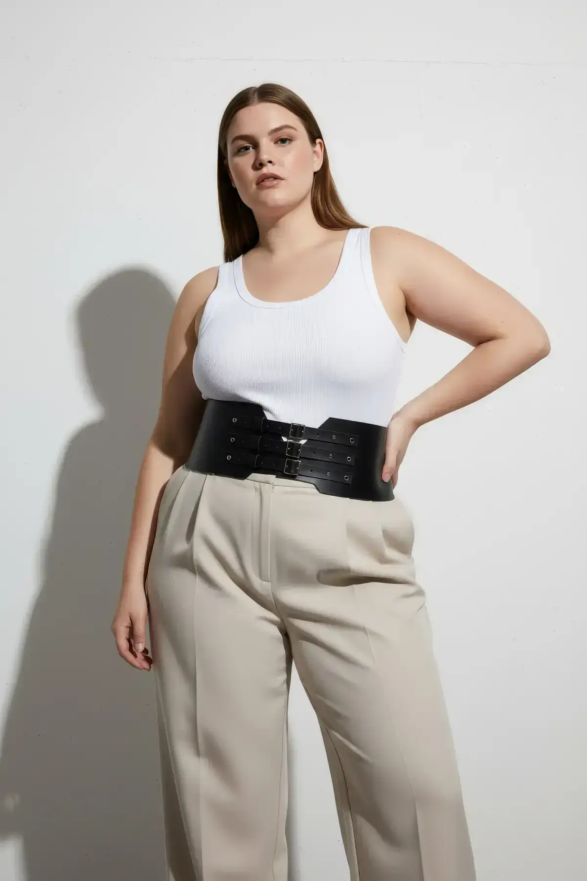 Define your shape with this dramatic, wide corset-style belt designed specifically for a plus-size fit. The bold three-buckle detail adds an undeniable edge, instantly transforming a simple dress or oversized shirt into a high-fashion statement. Crafted from supple black pu leather, this waist cincher offers both structure and comfort, ensuring you look and feel incredible all day long.
