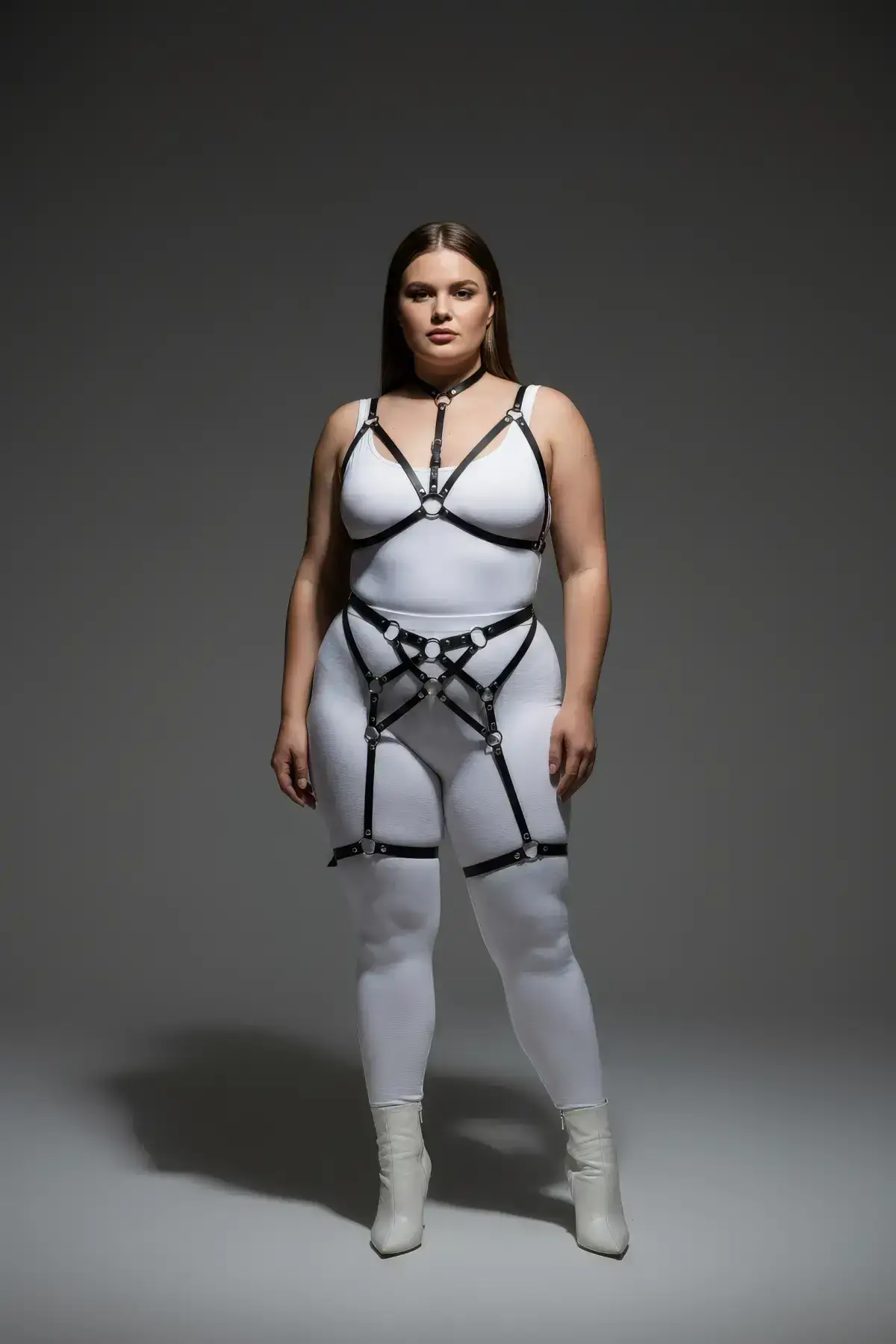 Step into the spotlight with this striking Plus Size Black Women’s Harness Set. The image reveals a dramatic, full-coverage design crafted from soft, comfortable elastic strapping, perfectly contouring the body. This full body harness features an intricate web of adjustable straps, connected by sleek silver-tone O-rings that add a subtle gothic fashion edge. Designed specifically for a size-inclusive fit, this statement body accessory is built for both confidence and comfortable stretch, making it the perfect piece for adding an instant visual pop to any outfit.