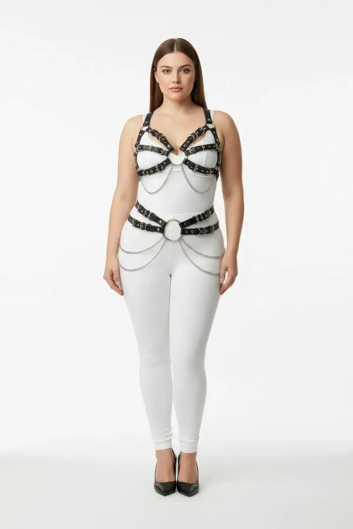 Finding the ideal plus size women’s harness set that combines both sex appeal and supportive structure can be challenging, but this design masters the balance. The high-quality elastic or faux-leather-style straps are generously sized and fully adjustable, making this a true one-size-fits-most **Body Harness** for a range of body shapes. The dramatic ring connectors at the chest and hips enhance the visual geometry, turning this simple set into a high-impact outfit enhancer. Wear it over daring lingerie, a simple slip dress, or even an oversized t-shirt for a fierce, unapologetic fashion statement.