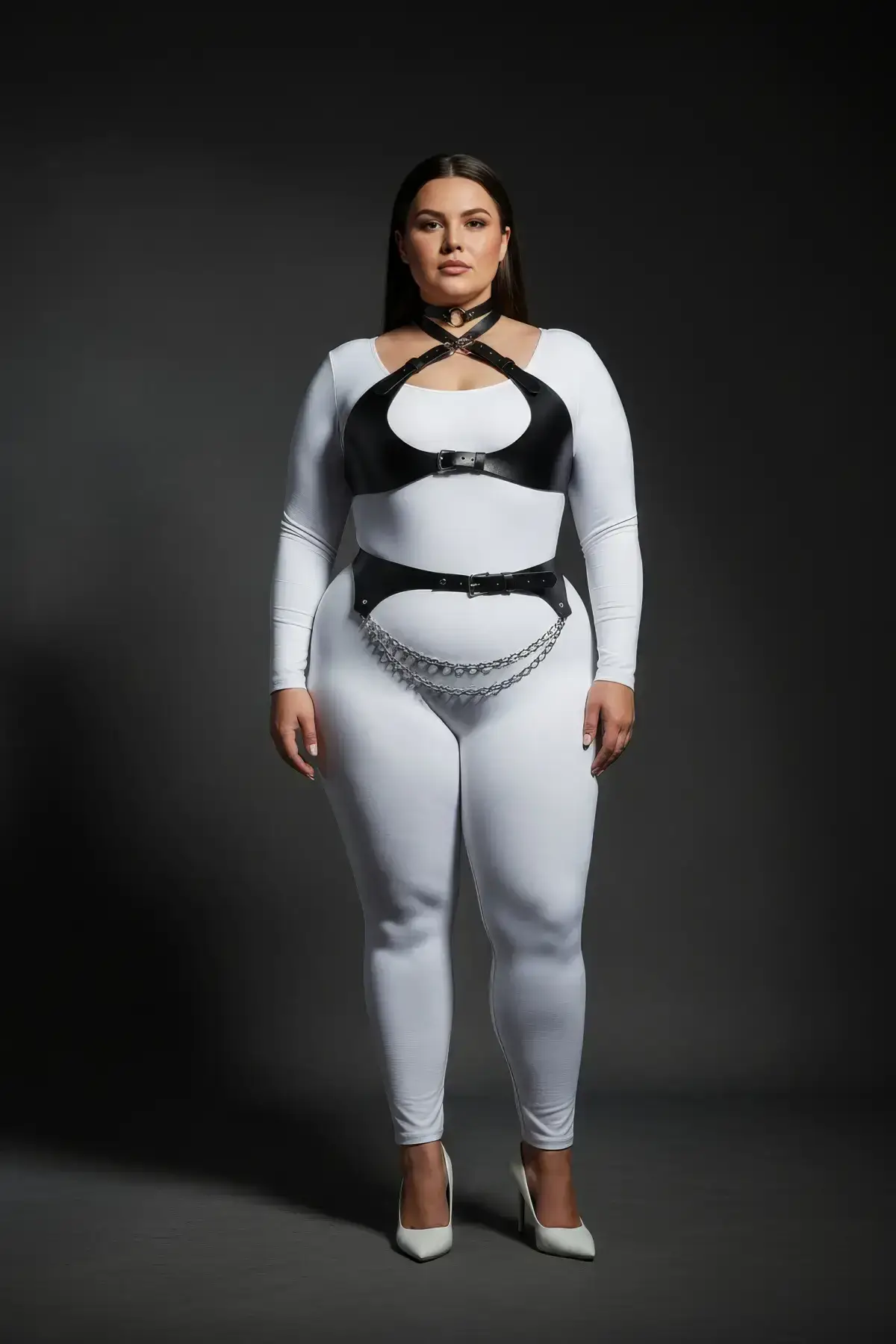 Unleash your inner confidence with the commanding Plus Size Black Women’s Harness Set. This provocative body accessory instantly transforms any ensemble, featuring a striking combination of thick, black leather-look straps and shimmering silver-tone chain details. The image clearly displays a multi-piece design that includes a powerful chest harness component with elegantly draped chains across the torso, creating an immediate focal point. Designed specifically for the Plus Size Black Women’s Harness Set market, it provides a flattering and secure adjustable fit, making it the perfect statement piece for special nights or layering under sheer clothing.