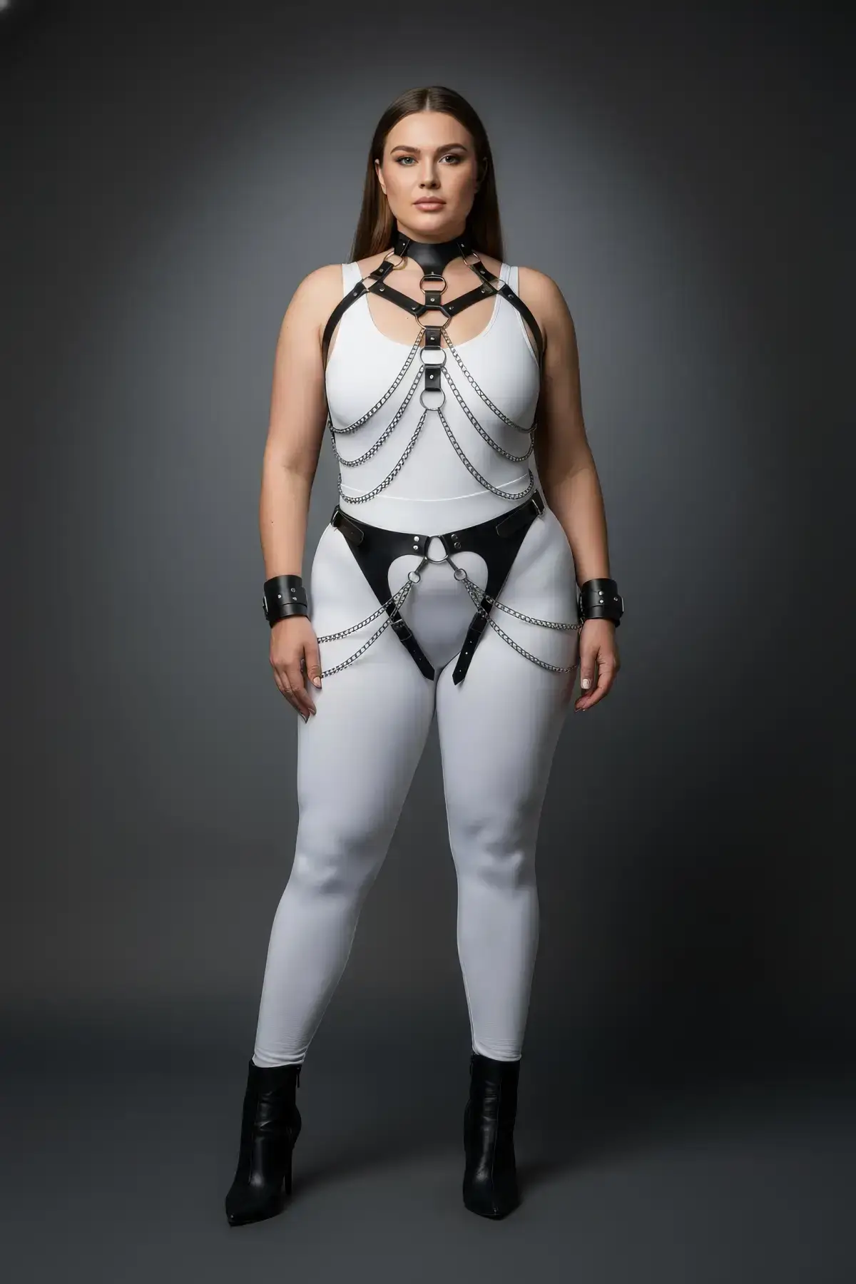 Unleash your inner confidence with the dramatic Plus Size Black Women’s Harness Set. This intricate, curve-hugging design is the ultimate statement piece, expertly crafted from sleek black faux leather. As seen in the image, the set features a visually striking full body harness with multiple straps creating an alluring cage effect across the bust and torso. The show-stopping element is the opulent silver chain detail that elegantly drapes across the front, transforming this from a simple accessory into a truly fancy accessory for a powerful, seductive look. Designed specifically for the plus size silhouette, it ensures a comfortable and flattering fit.