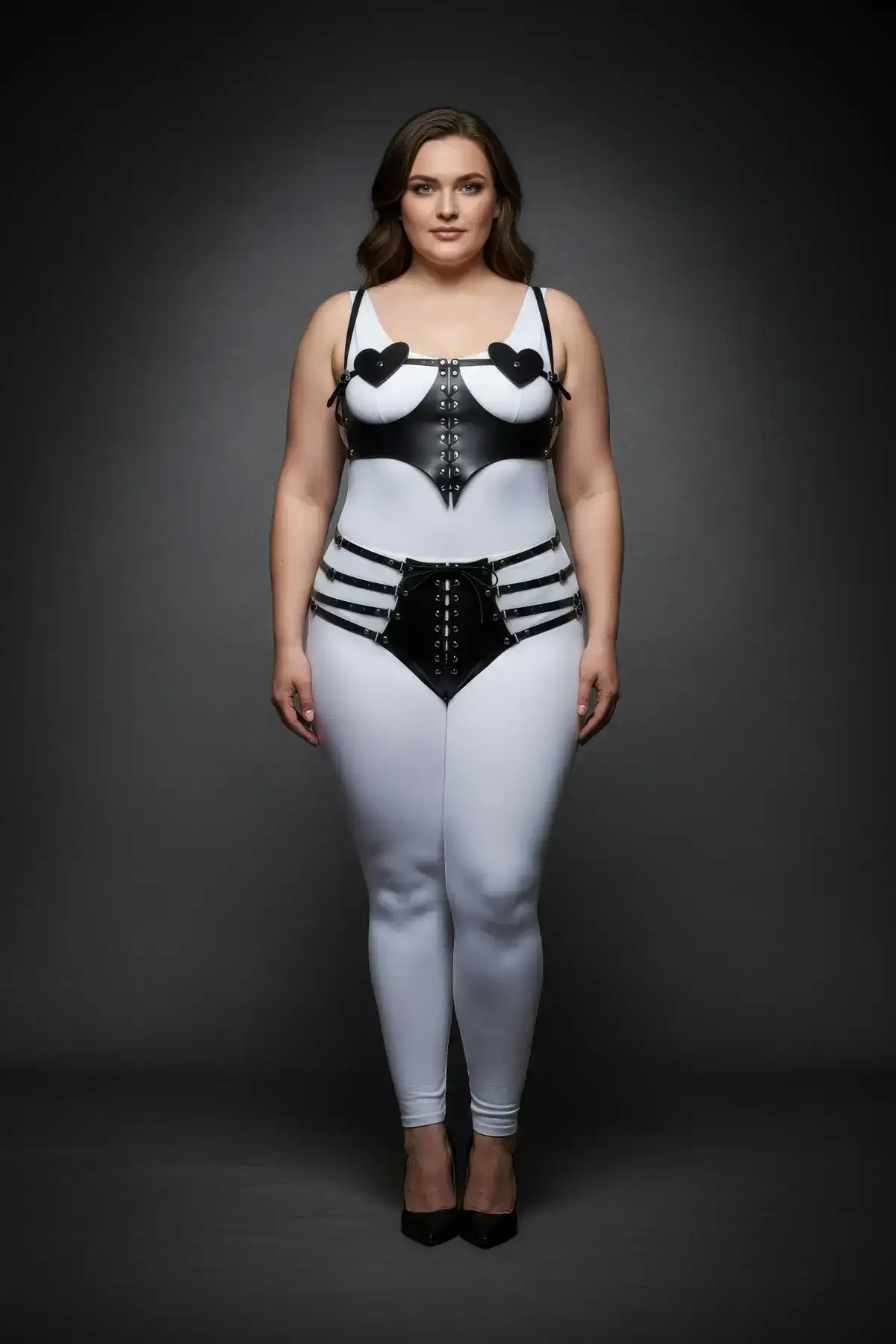 This plus size harness set is perfect for adding bold structure to any outfit, whether worn alone or layered under a sheer top.